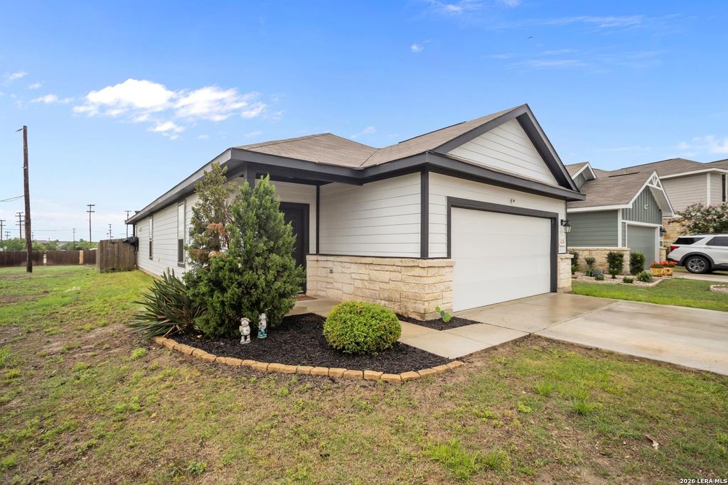 Welcome to this charming 3-bedroom, 2-bath home in San Antonio offering a spacious open floor plan that seamlessly connects the living room and kitchen, perfect for both everyday living and entertaining. The kitchen features granite countertops, stainless steel appliances, and ample cabinet and countertop space. The primary bedroom is generously sized, and the en-suite bath includes a double vanity and a walk-in shower for added comfort. All secondary bedrooms are well-sized and versatile, making them ideal for guest rooms, home offices, or additional living space. Step outside to enjoy a covered patio overlooking a large backyard, providing plenty of space for outdoor activities, pets, or future additions. This home also includes an integrated smart home system and energy-efficient features for added convenience and savings. Conveniently located in a desirable area near major highways, shopping, and dining, with easy access to Fort Sam Houston and Randolph Air Force Base.