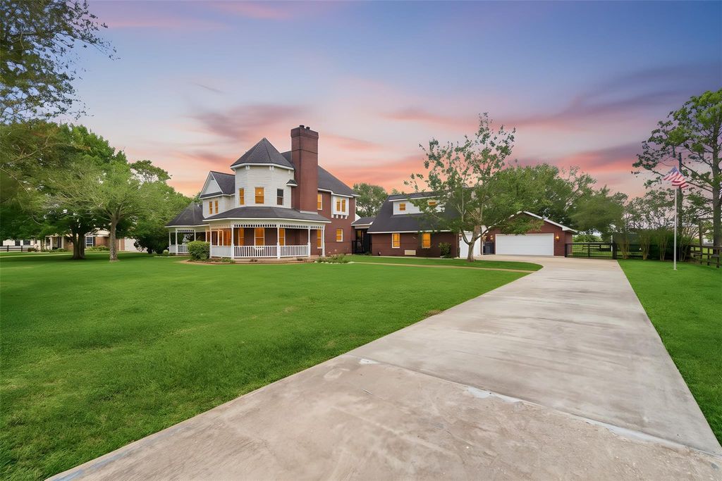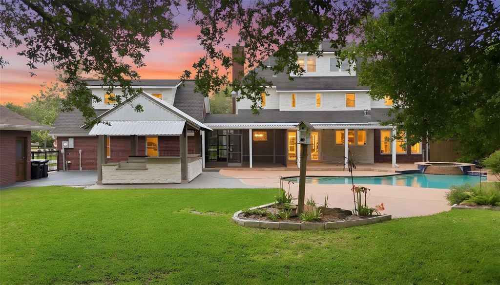 Exceptional Rancho Viejo estate on 3 fully fenced acres with barn, pool, RV-capable storage building and dual garages, just steps from 33-acre Lake Friendswood Park. This 3,600 sq ft 4 bed/3.1 bath home has space for horses and exceptional finishes throughout. Remodeled in 2018, it features rich custom woods, slate and wood flooring, mesquite trim, Andersen shatter-resistant windows and designer lighting. The showpiece kitchen features a dramatic copper ceiling, oversized island, Wolf range, upgraded countertops, and more. French doors open to a private outdoor retreat with waterfall pool, outdoor kitchen and cabana with bath and outdoor shower. Additional highlights include insulated, air-conditioned garages with workshop and office space above, a 3,000 sq ft barn with two stalls, a fully-shelved storage building with RV-sized bay and dedicated power hookup, plus an additional storage shed—delivering exceptional function in one of Friendswood's most sought-after acreage communities.