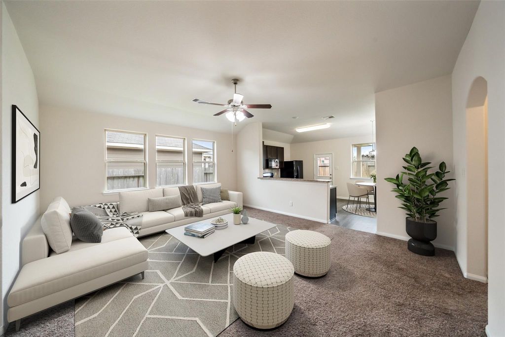 This stunning brick and stone 4-bedroom home blends timeless curb appeal with modern comfort. Inside, luxury vinyl plank flooring flows through the main living areas, leading to a spacious open-concept living room with an eat-at bar—perfect for casual dining and entertaining. The private primary suite features an elegant tray ceiling and a spa-like bath with separate soaking tub, walk-in shower, dual vanities, and a generous walk-in closet. Three additional bedrooms offer flexibility for guests, family, or office space. Step outside to a covered back patio overlooking a large backyard with endless possibilities for outdoor living. Ideally located just minutes from Conroe, with convenient access to shopping, dining, and retail.