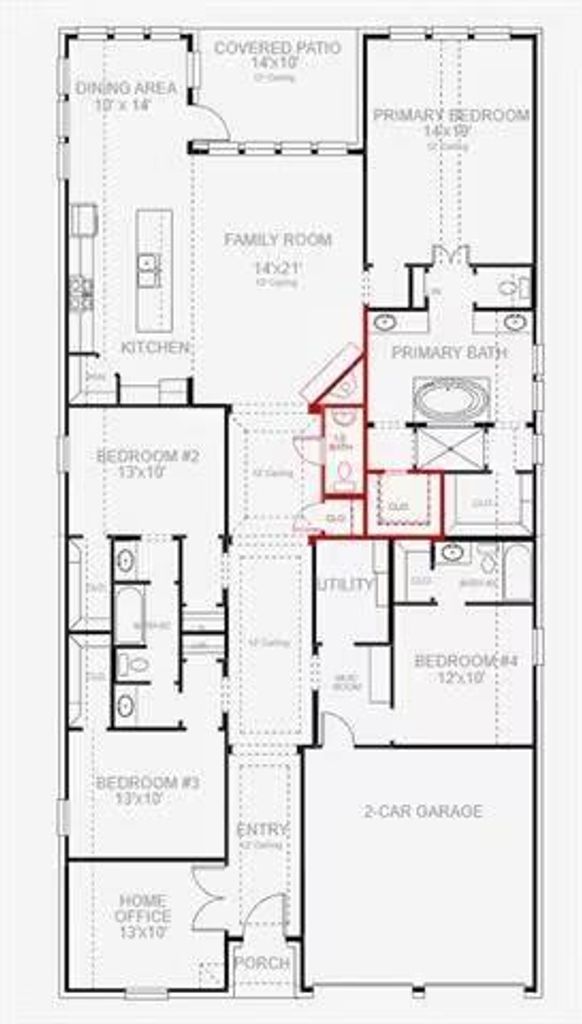 The primary suite serves as a luxurious retreat, featuring a 12-foot ceiling, dual vanities, a soaking garden tub, a glass-enclosed shower, and expansive walk-in closets. Step outside to enjoy year-round relaxation on the covered patio overlooking your private backyard.