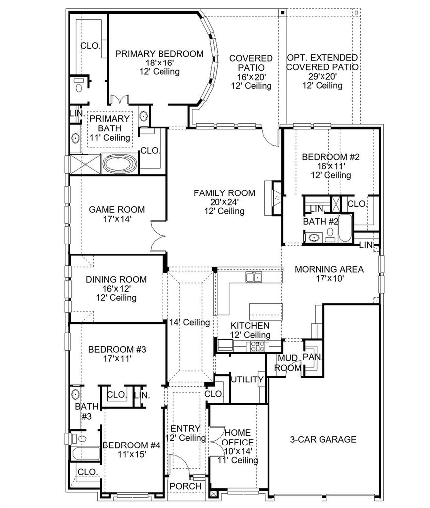 Home office with French doors set at entry. Formal dining room with abundant natural light. Open family room with a wood mantel fireplace and wall of windows flows into kitchen and morning area. Private guest suite with full bathroom and linen closet adjacent from the morning area. Kitchen features island, a 5-burner gas cooktop, double wall oven and walk-in pantry. Secluded primary suite with curved wall of windows. Primary bath includes a freestanding tub, separate glass-enclosed shower, dual vanities and two deep walk-in closets. Secondary bedrooms with walk-in closets connect with a Hollywood bathroom. Game room with French doors and wall of windows. A utility room, abundant closet and storage space complete this floorplan. Extended covered backyard patio. Mud room just off the three-car garage with additional garage bay space.