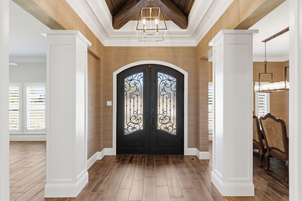 Don’t miss the rare opportunity to own this one-of-a-kind, stunningly updated traditional gem. Nestled in a desirable neighborhood among lush fruit and nut trees, this brick home offers exceptional curb appeal and the privacy of backing up to a peaceful mini-ranch. Step through the double iron doors into a breathtaking entryway featuring grass-cloth walls, showstopping wood-beamed ceilings, and a luxury chandelier. Throughout the home, you’ll find durable wood-like tile flooring, custom lighting, and new windows fitted with 4 inch shutters. The heart of the home is a chef’s dream kitchen, boasting professional-grade 6-burner gas range top with a griddle, double ovens and a sleek concealed refrigerator. Expansive counter space and an open view of the living area which is anchored by a custom built-in entertainment center with adjustable glass shelving and dimmable lighting—perfect for cozy movie nights by the fireplace. This thoughtful one-story floor plan features a unique 3-way split for maximum privacy. 4 Spacious Bedrooms; each featuring walk-in closets, ceiling fans, and recessed lighting. The primary retreat is a spa-like sanctuary with a massive walk-in shower, dual shower heads, a built-in bench, and an adjustable steam-venting window. All bathrooms have been smartly updated with custom cabinetry, exquisite mirrors, and beautiful marble and tile finishes. The game room seamlessly transitions from indoor to outdoor fun through sliding glass doors that lead to an extended patio with a mounted TV. Behind a stylish sliding barn door lies a mudroom with a separate exterior entrance leading to a bonus room or office—ideal for a home-based business. The Garage; an oversized 3-car garage designed for flexibility, allowing tandem parking up to 6 compact cars. Escape to your private backyard paradise. Relax under the stars on the extended patio or take a dip in the sparkling saltwater pool. This residence checks all the boxes.