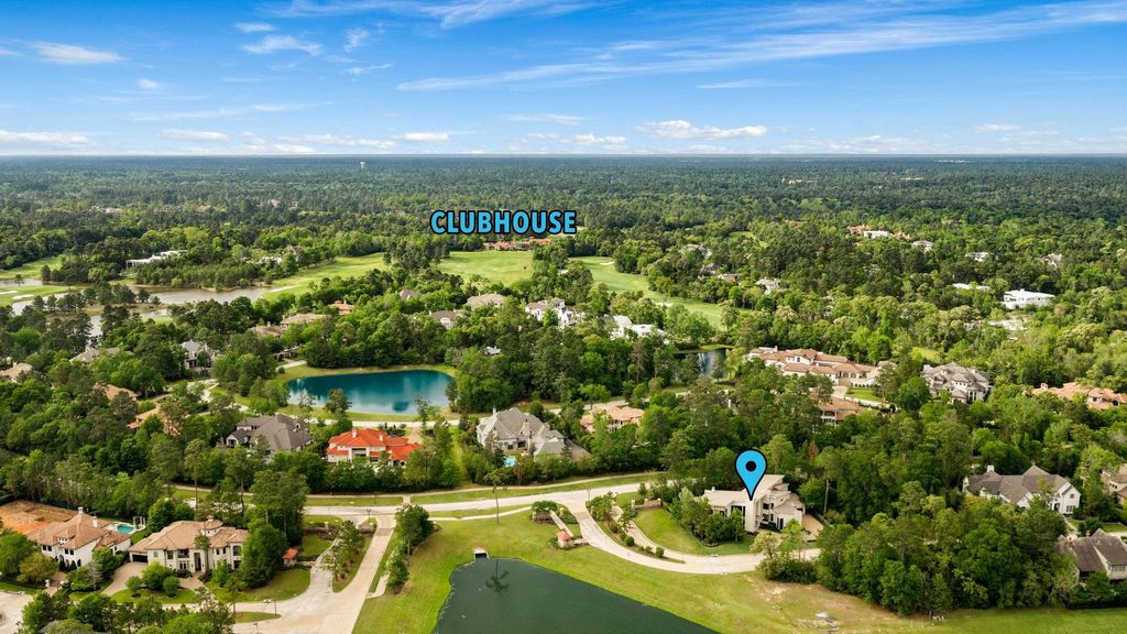 ABSOLUTELY STUNNING! Situated on a corner lot w/water views in gated Carlton Woods Creekside, this modern/contemporary home showcases exceptional craftsmanship & attention to detail. Walls of windows fill the home w/natural light and capture captivating views. Soaring two-story ceilings, dramatic light fixtures & a floating staircase set an elegant tone. Formal living & dining feature a built-in credenza w/wine fridge, while a private study w/ pocket doors offers flexible workspace. The primary suite includes dual closets, spa bath, jetted tub, walk-in shower, marble counters, dual-sided fireplace & remote drapes. Open family room & kitchen w/ leathered granite island, Thermador appliances & Sub-Zero fridge. Oversized utility w/sink & icemaker doubles as prep kitchen. 1st floor guest suite shares pool bath; upstairs offers 3 en-suite bedrooms, game room, balcony & kitchenette. A single garage converted to a home gym easily converts back. Savant lighting & 48KW Generac generator.