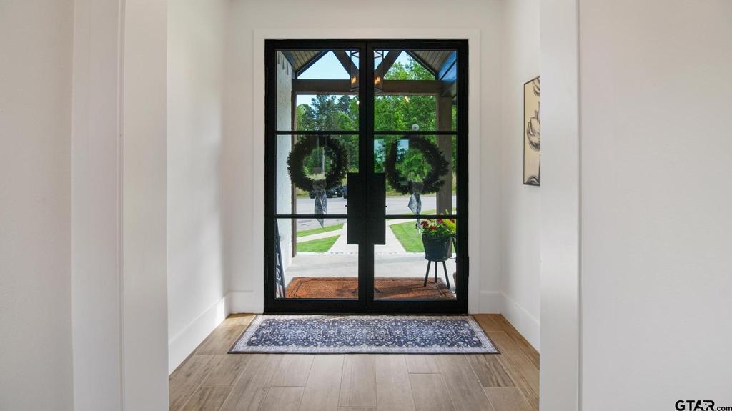 Enjoy comfort and style in this beautifully crafted 2,550 sq ft home, perfectly positioned just minutes from Loop 49, on a quiet cul-de-sac within a private gated community. Inside welcomes you to a stunning open living space with vaulted wood beam ceilings, designer lighting, and expansive windows that flood the home with natural light. A floor-to-ceiling fireplace anchors the space with modern finishes, while wood-look tile adds a warm, balanced feel. The chef's kitchen is complete with a five-burner gas stove, apron-front sink, large walk-in pantry, double convection oven, custom cabinetry, and beautiful quartz countertops. The primary suite offers a serene pool view and a spa-inspired bath with a pedestal soaking tub, walk-in shower, dual vanities, and a custom closet with direct access to the laundry room. The split floor plan ensures privacy, with two comfortable guest bedrooms downstairs and a full guest bath. Upstairs features a spacious fourth bedroom with a full en-suite bath and walk-in closet, designed for use as a game room, media room, or private guest suite. Step outside to a covered back porch and sparkling pool, creating an inviting outdoor retreat with a fenced yard and ample space for lounging or entertaining. A thoughtfully designed, separately fenced dog run also conceals the pool equipment, preserving the clean, polished look of the main backyard. The home is also equipped with a sprinkler system, smart outlet timers for outdoor lighting, and clean landscaping ready for your personal touch. Additional highlights include a convenient dog washing station, built-in mudroom storage and durable epoxy floors in the 2-car side-entry garage. Schedule your private showing and experience this home in person.