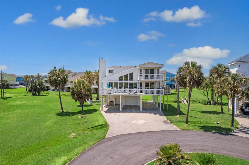 Welcome to Paradise! Spectacular beach views from inside the house and from the decks at this updated two-story located on an oversized cul-de-sac lot in Pirates Beach! High ceilings and an open floor plan contribute to the coastal feel, while walls of windows showcase the views of the Gulf. Loaded with natural light, the main level features the living room with a woodburning fireplace, dining, and a truly updated kitchen, plus two guest bedrooms and an updated full bath. Upstairs is the primary bedroom with a large, updated bath plus an additional guest bedroom / second primary bedroom with an updated full bath. The lot next door is also for sale, to be sold separately, and the mandatory Galveston Country Club social membership conveys. There are electric storm shutters plus an electric exterior lift. NEW roof and 2 HVAC 2026! A very special place to call home.