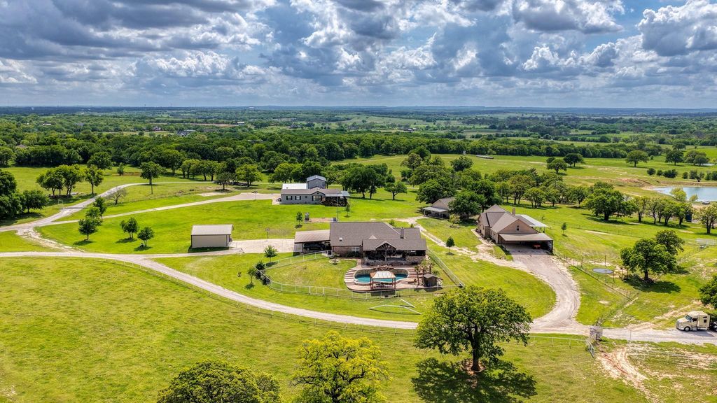 Salt Creek Ranch – Premier Equine Estate Near Fort Worth Salt Creek Ranch is an exceptional 165-acre equine property located just minutes from Fort Worth, Texas. Designed with multi-generational living in mind, this remarkable ranch is a rare combination of natural beauty, functionality, and top-tier equestrian amenities. Nestled among the rolling hills of Wise County, the land is rich in water resources and covered in high-quality coastal Bermuda grass. The property features 11 expansive ponds stocked with bass and catfish, along with an abundance of mature oak trees providing natural shade for livestock. At the heart of the ranch, the equine facilities are thoughtfully designed to meet a variety of needs. The main barn includes 10 horse stalls, a wash bay, bunkhouse, tack room, and 10 well-maintained turnouts. The arena is fully equipped with calf returns, roping boxes, a head chute, and sandy soil—ideal for training and performance. The ranch is fenced and cross-fenced with precision, offering catch pens for both cattle and horses, each with convenient access to water. Water infrastructure is a standout feature, with five high-producing wells supporting both agricultural and ranching operations. Salt Creek Ranch offers three primary residences: A beautifully appointed 4-bedroom, 3-bath brick home featuring a pool and breathtaking views. A second 5-bedroom, 3-bath brick home with stunning sunset vistas. A spacious, expanded doublewide home offering 5 bedrooms and 3 baths Additional improvements include a dedicated gathering house with kitchenette and bath—perfect for hosting holidays and events—and a metal office building near the main entrance, previously used for K-9 grooming. This is a rare opportunity to own a ranch of this caliber in close proximity to the Dallas-Fort Worth metroplex—offering the perfect balance of privacy, productivity, and convenience.