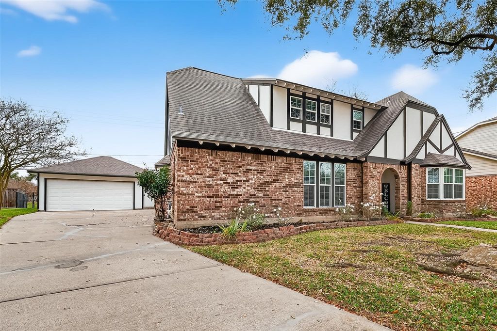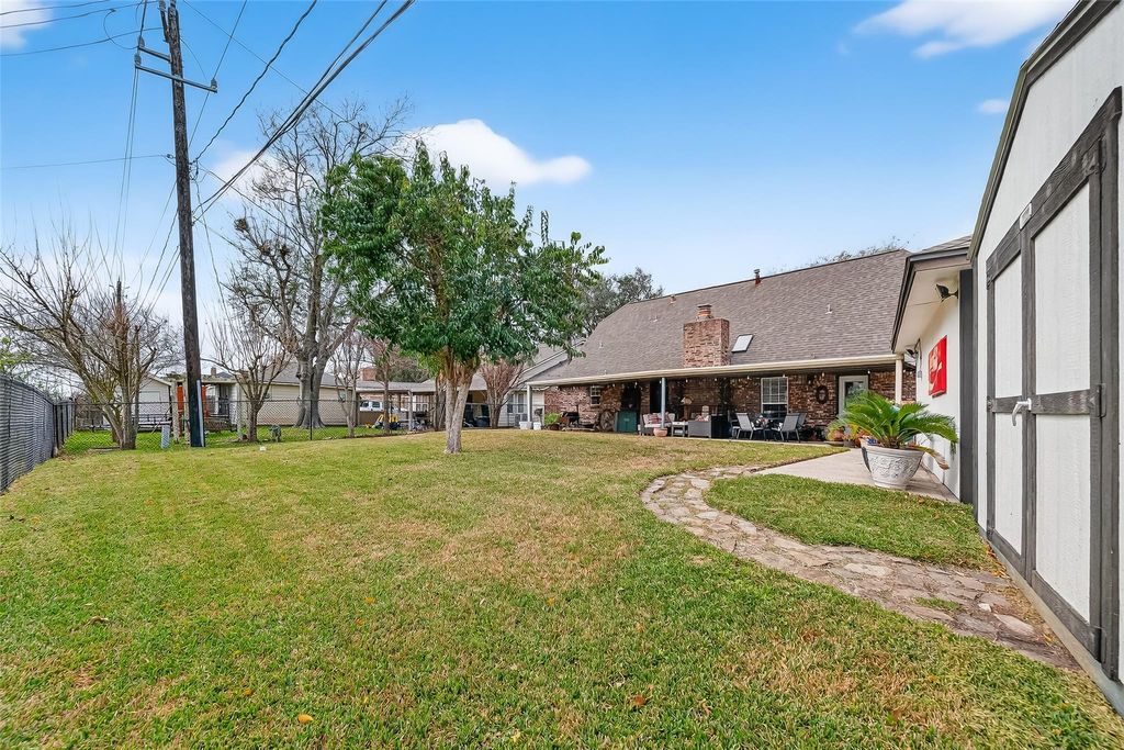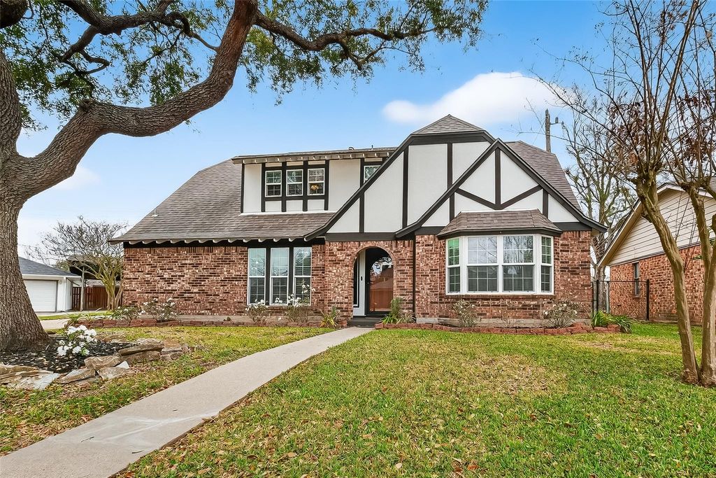 Beautifully updated home with bright kitchen including quartz countertops, apron sink and breakfast bar - family room with block paneling, built-ins and cozy fireplace - spacious primary bedroom is downstairs with bay window overlooking tree-shaded front yard - primary bath updated with dual counter-mounted sinks - upstairs includes 3 additional bedrooms plus large full bathroom - wood French doors open off family room into formal dining - 1/2 bath off utility room - large covered patio overlooks fenced yard and storage building - Other updates include PEX plumbing and windows