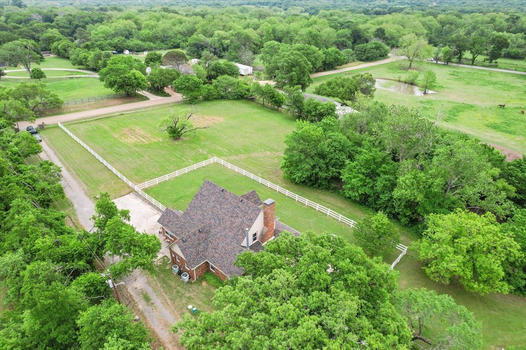 Step into spring on nearly five acres in Mansfield ISD, just 5 miles from historic downtown Mansfield, outside city limits with no city taxes and no HOA. Room to breathe, room to build, room to live the way you actually want to live. The home offers two bedrooms, two and a half baths, and a loft, with hardwood floors throughout the main living areas. The primary suite is a room that earns its keep. A cast iron wood burning stove anchors one wall, black and white hex tile runs underfoot in the bath, and a clawfoot tub holds court between two vanities that began their lives as antique dressers. It is the kind of bathroom that makes you rearrange your morning. The kitchen is built for serious cooking with a central island, double oven, new cooktop, new dishwasher, and granite counters. The layout moves well, with a natural flow between the kitchen, living areas, and outdoors that suits both quiet mornings and full gatherings equally. A covered wraparound porch, multiple living areas, and a stone outdoor patio with covered pergola mean there is always somewhere to be. Custom energy efficient windows throughout keep the home light-filled and comfortable year round. Outside, perennial gardens frame the front and side of the home, coming into their full spring stride right now. This is a property that rewards the person who notices those things. The entire acreage is fenced with a combination of fencing, with a pond, mature trees, and a greenhouse that make the grounds as compelling as the home itself. The kind of place where the holidays feel the way they're supposed to, and where quiet mornings feel just as good. The infrastructure is what sets this property apart: a 40 x 48 powered workshop, white perimeter fencing, and nearly five level acres outside city limits. The possibilities are genuinely open.