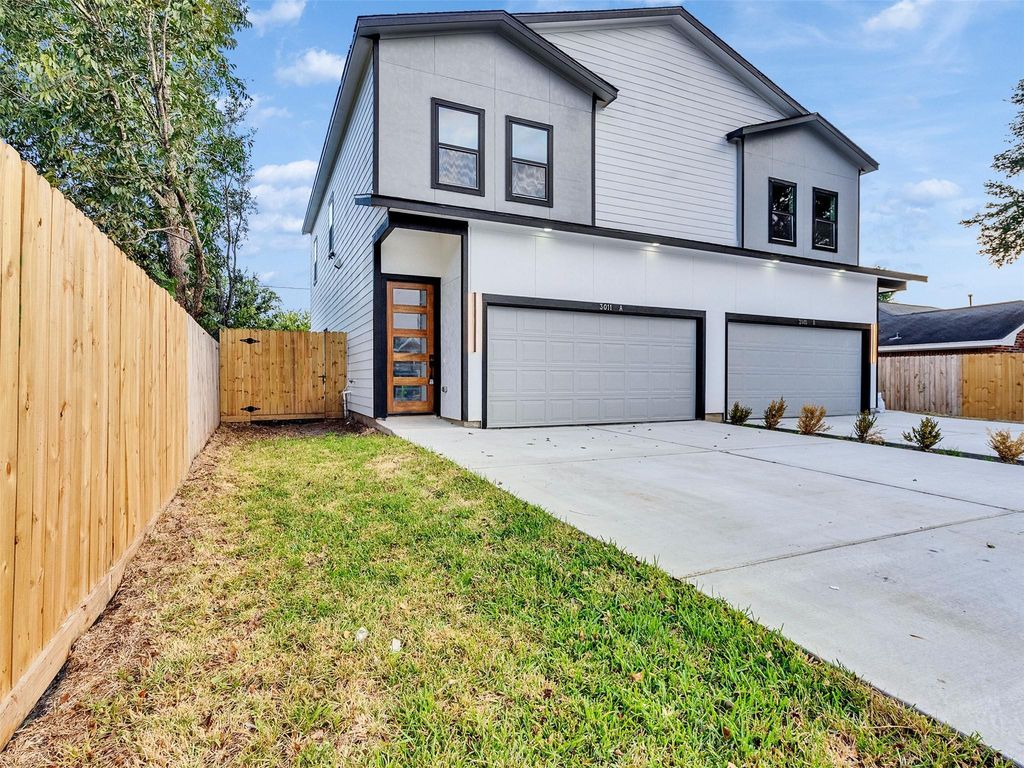 New construction duplex completed in 2025, located in Houston's Griggs Terrace, University Area. Never lived in. Two fully independent 3-bed/2.5-bath units, each with a private 2-car garage and fenced backyard. 3,536 sq ft total, two-story layout with high ceilings, large windows, and luxury vinyl plank flooring throughout. Kitchen (10x16): quartz countertops, stainless steel appliances, island, two-tone cabinetry. Primary suite (13x15): dual-sink vanity, quartz counters, tiled tub/shower. Secondary bedrooms: 12x10 and 11x10. Half bath on main floor. Laundry connections per unit. Refrigerator, microwave, dishwasher, disposal, and alarm system included. Living room: 19x18. Central electric/gas HVAC. Composition roof. 5,000 sq ft lot. No HOA. No restrictions. Floor plan attached. Minutes from Texas Medical Center, University of Houston, TSU, Downtown Houston, Midtown, and the Museum District.