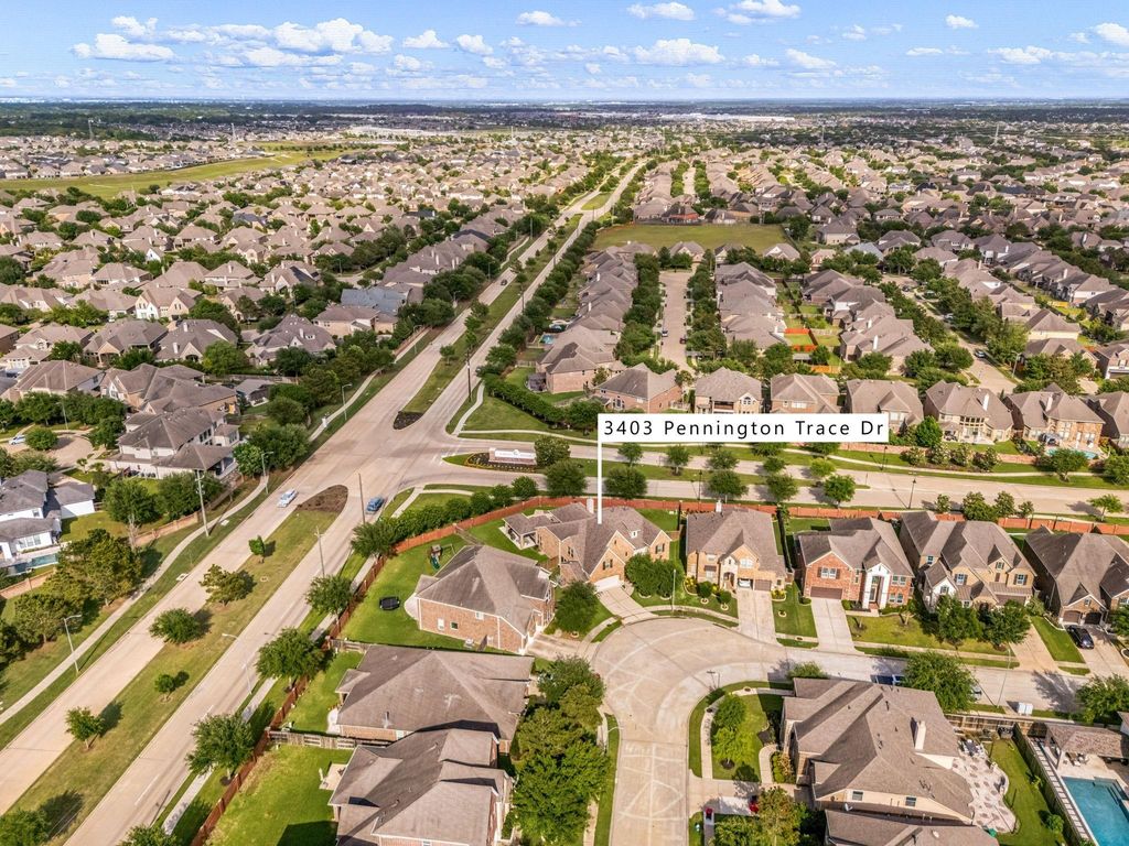 Welcome to 3403 Pennington Trace, a stunning retreat on a cul-de-sac lot Canyon Lakes at Cardiff Ranch. Zoned to the Katy ISD, this spacious 5-bedroom home blends comfort with high-end style, perfect for both quiet evenings and lively entertaining. The inviting foyer opens to a private study and formal dining room, leading into a bright, open-concept heart of the home. The chef-inspired kitchen features rich cabinetry, granite countertops, and an oversized island that overlooks a sun-drenched family room anchored by a cozy fireplace. Retreat to the primary suite featuring a walk-in shower, garden tub and a massive walk-in closet. Upstairs, the game and media rooms offer the ultimate space for movie nights or play with 3 spacious secondary bedrooms. Step outside to your private backyard oasis, complete with an expansive covered patio and a refreshing pool. Enjoy a resort lifestyle at Cardiff Ranch with a clubhouse, gym, and pools—all minutes from LaCenterra’s dining and shopping.