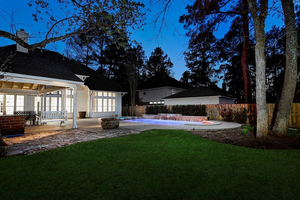 Nestled on a large wooded lot in the heart of Cochran’s Crossing, this stunning LifeForms home offers timeless elegance and exceptional indoor-outdoor living. A dramatic two-story entry with a sweeping wrought iron staircase welcomes you into light-filled spaces featuring hardwood and tile floors, designer carpet, and generously sized rooms. The open-concept kitchen showcases granite countertops, a spacious island with breakfast bar, stainless steel appliances, and abundant cabinetry, all overlooking the breakfast area and soaring two-story living room with gas log fireplace and floor-to-ceiling windows. The primary suite offers a peaceful retreat with a sitting area, while upstairs includes three bedrooms and a media room. Step outside to a private backyard oasis surrounded by mature trees, featuring a sparkling pool and spa, outdoor kitchen, and covered patio wired for sound—perfect for entertaining or relaxing in your own resort-style setting. Truly a must see, this won't last long!