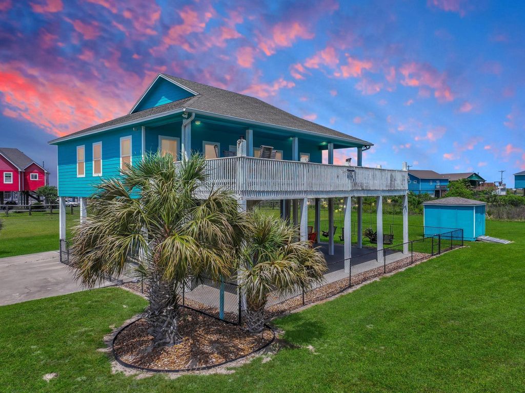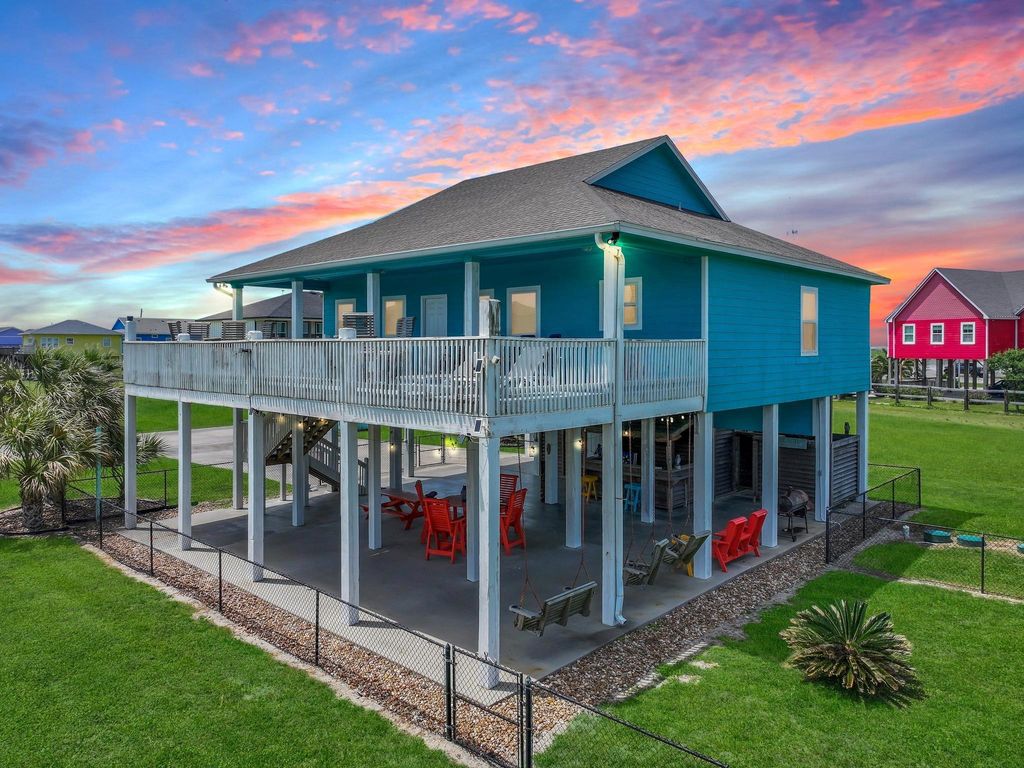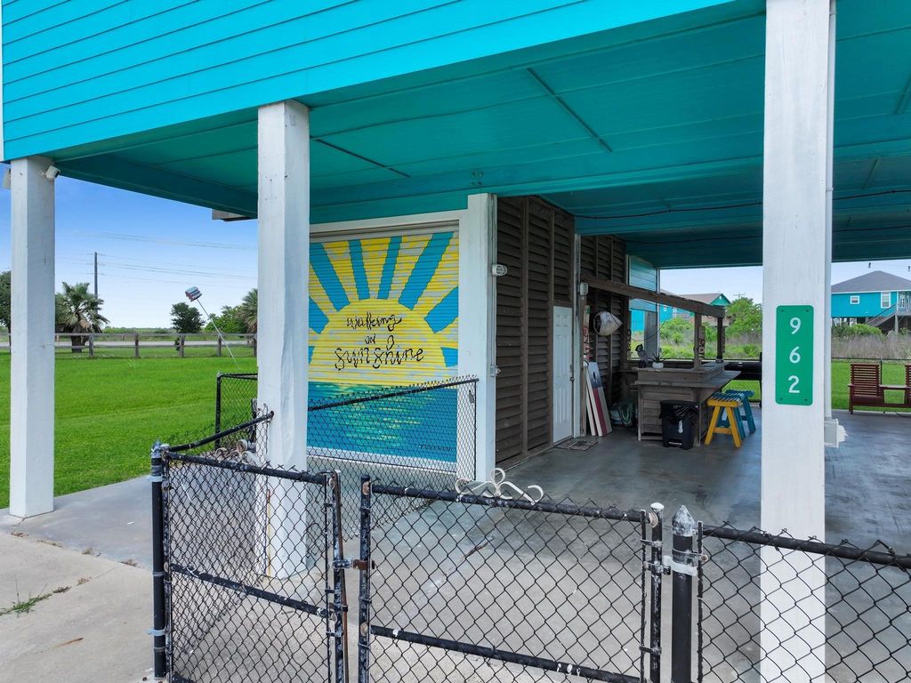 962 Surfside Drive is located in a gated community on Bolivar Peninsula, just minutes from beach access. This elevated coastal home offers an open living, dining, and kitchen layout designed for gathering and entertaining. The kitchen includes ample cabinetry, generous counter space, and an island with seating. The home features multiple bedrooms with flexible use for family, guests, or rental income. The primary suite includes a private bath, and additional bedrooms are spacious and functional. Downstairs, a large covered area creates the perfect entertaining space with a custom bar, seating, and swing area. The fenced yard provides room for outdoor enjoyment, and a detached storage building offers space for beach gear and equipment. Easy access to Hwy 87. Ideal for a second home or investment property.