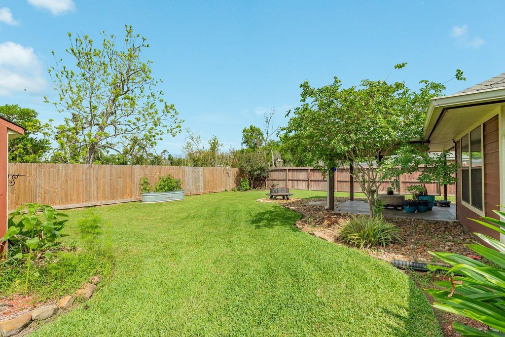 This well-designed home features a split floor plan that offers both privacy and functionality. The kitchen is equipped with solid wood-stained cabinets, abundant storage, and a breakfast bar that opens seamlessly into the living area, making it ideal for everyday living and entertaining. An indoor utility room is conveniently located just off the garage for added convenience. Enjoy outdoor living with covered front and back patios, perfect for relaxing or hosting guests. The backyard includes a storage shed and no back neighbors, providing added privacy and space. Conveniently located with easy access right off FM 2004, making commuting simple.