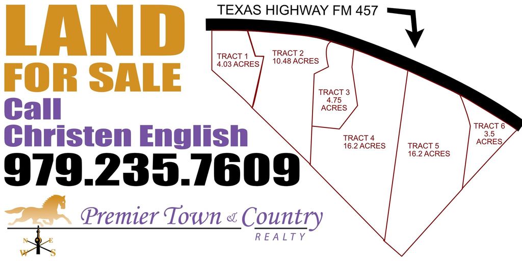 There are four available tracts which include a 10.49 acre tract, two 16.20 acre tracts and a 3.5 acre tract. All have direct access from FM 457 and road frontage. The land is currently ag exempt and all or part is available for purchase.
