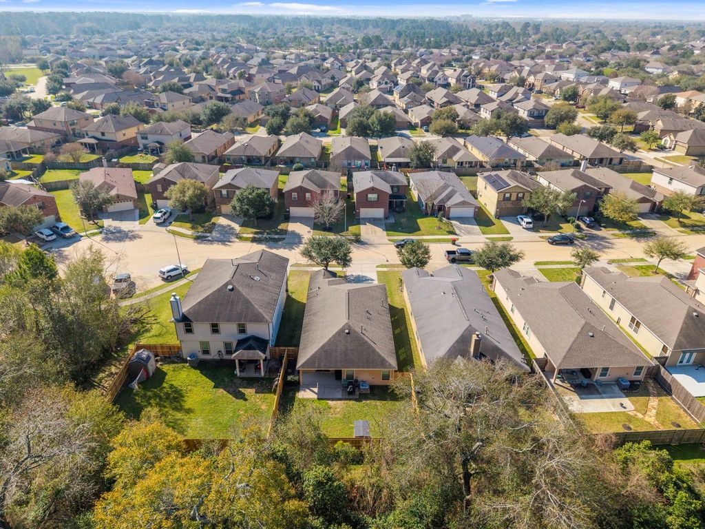 Welcome to this beautiful, well-maintained one-story home in the desirable Stablewood Farms subdivision, located within the acclaimed Cy-Fair ISD. This 3-bedroom, 2-bathroom residence features a seamless open-concept layout with a mix of durable tile and rich laminate wood flooring. The kitchen offers a stainless steel gas range and a breakfast bar overlooking the sun-drenched dining and living areas. The primary suite provides a private retreat with views of the greenery and an en-suite bath featuring a separate shower and soaking tub. Step outside to ultimate privacy with no back neighbors; the backyard opens to a serene tree line. Enjoy the covered patio with an included outdoor TV and a convenient storage shed. This gem on a quiet street won't last long. Schedule your appointment now!