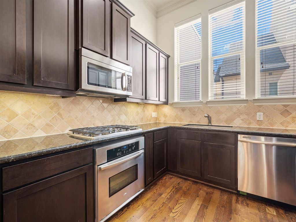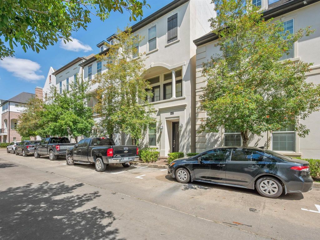 Gorgeous freestanding home n a gated community, ready for immediate move-in. This stunning residence shows like a model and features soaring ceilings, beautiful hardwood floors, and open-concept living spaces filled with natural light. The inviting living area includes a gas fireplace and flows seamlessly into a gourmet kitchen with stainless steel appliances, and granite countertops. The spacious primary suite offers a spa-like bath with stylish finishes and an enormous walk-in closet. Additional highlights include a versatile flex space, multiple outdoor living areas, a private balcony, and a spacious terrace with peaceful, views. Relax or entertain on the private balcony, or expansive terrace overlooking peaceful views and the beautiful Houston skyline. Ideally located with convenient access to the Texas Medical Center, NRG Stadium, Rice Village, and Downtown Houston. This exceptional home combines luxury, comfort, and convenience. Come make it house your new home!