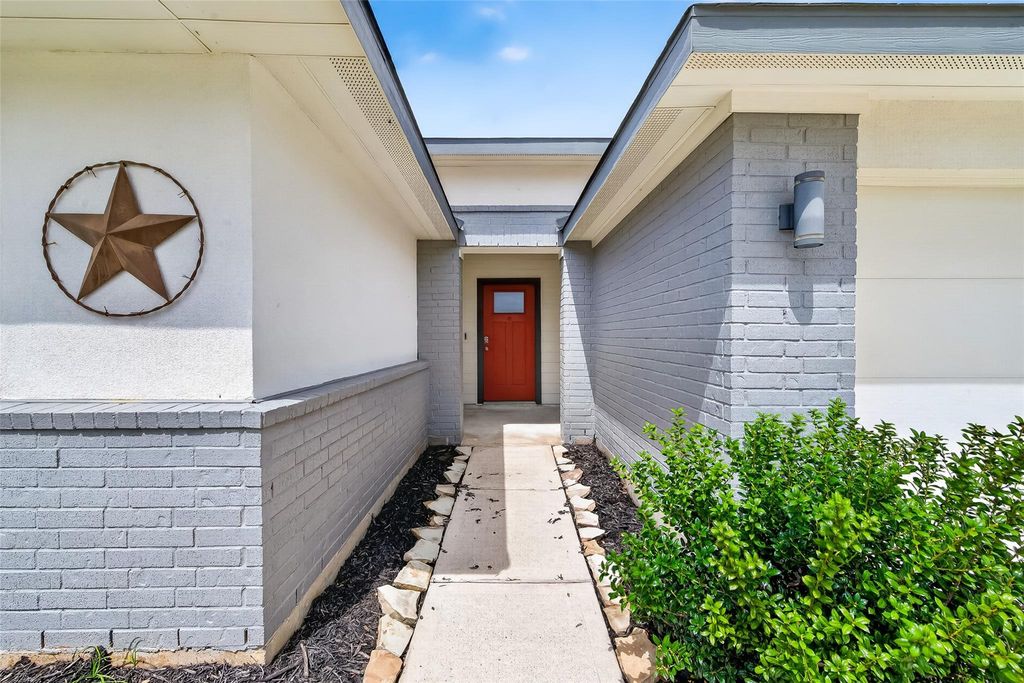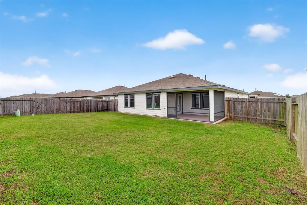 This beautiful 4-bedroom, 2-bath home offers a modern open-concept layout designed for both comfort and functionality. Built in 2021, The kitchen features quartz countertops and flows seamlessly into the living and dining areas, creating an ideal space for entertaining and everyday living. The living room is accented by a stylish electric fireplace, adding warmth and a contemporary touch. The primary suite is thoughtfully positioned on the opposite side of the home from the secondary bedrooms, providing added privacy. The primary bathroom includes a double vanity, soaking tub, and separate shower, creating a relaxing retreat. Fridge, washer, dryer and Water softener system included! Step outside to enjoy the covered patio that has been fully screened in, allowing you to cook, entertain, and spend time outdoors comfortably without the worry of insects. Enjoy easy access to shopping, dining, and major highways, with Downtown Houston about 35 min away. Come tour this beauty today!