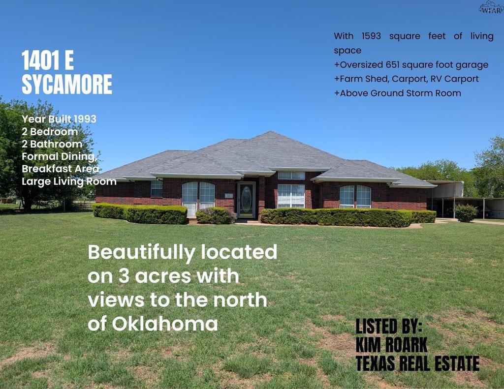 1401 E Sycamore Drive is listed for sale at $ 299,900. The Single Family property has 2 bedrooms, 2 Full Bathrooms, 1579 square feet and was built in 1993. A very special custom built home on 3 acres with beautiful views of Oklahoma. I love the kitchen the heartbeat of the home and the large living room. It is only 2 bedroom, yet one could enclose formal dining area or extend a room onto the back porch if needed. A rare find with 3 acres in the city limits with a water well in addition to City Water Supply. Tons of storage and there are 3 carports for Boat, RV, Toys or enclose it all for more Barn/Workshop Space. Above ground Storm Room. Fabulous Burk Schools