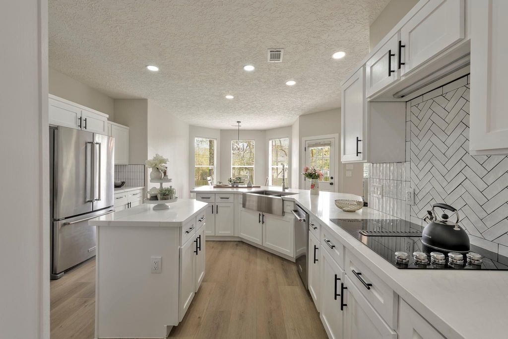 Beautifully remodeled home on half-acre lot showcases open central living with kitchen, dining, and family areas at heart of home, perfect for entertaining and daily life. Split floor plan places primary suite with spa-like bathroom and striking egg-shaped soaking tub on one side, while two additional bedrooms sit on opposite side for privacy and versatility. Gourmet kitchen features modern cabinetry, quartz countertops, and ample workspace. Half bath and flexible rooms provide ideal spaces for office, hobby, or guests. Expansive backyard with mature trees creates serene retreat for outdoor gatherings, relaxation, or gardening. Located about 14 miles from The Woodlands’ shops, trails, and dining, with easy commute to ExxonMobil Houston campus and major employment centers, combining sophisticated updates, thoughtful design, and prime location for comfortable, stylish living. Call for private showing!
