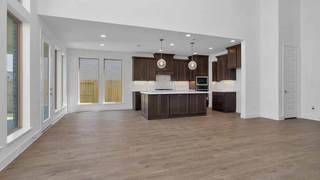 READY FOR MOVE-IN! Home office with French doors set at two-story entry. Formal dining room across from staircase. Two-story family room opens to kitchen and morning area. Family room features wall of windows. Kitchen features deep walk-in pantry, Butler's pantry, 5-burner gas cooktop and large island with built-in seating space. First-floor primary suite includes bedroom with wall of windows. Double doors lead to primary bath with dual vanities, garden tub, separate glass-enclosed shower and two walk-in closets. An additional bedroom is downstairs. A game room and secondary bedrooms are upstairs. Covered backyard patio. Mud room off three-car garage.