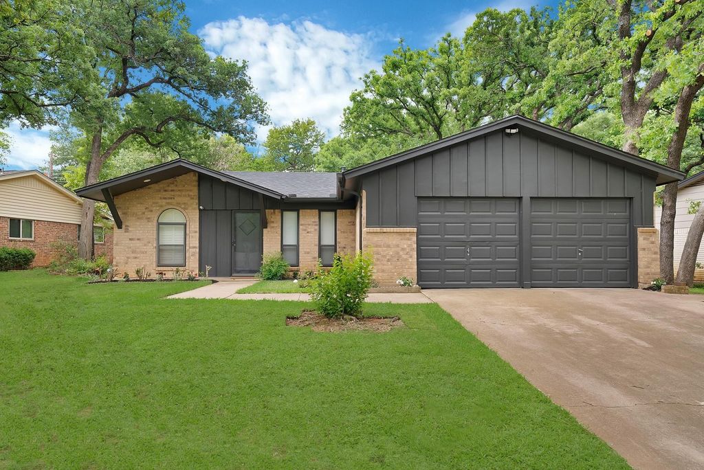 ANOTHER ONE. Soundtrax LLC, Arlington's gold standard in residential renovation, is back with a FULLY RENOVATED 3-bedroom, 2-bathroom home WITH A POOL in WOODLAND WEST and zoned for DUFF ELEMENTARY. This is the complete package: two living spaces, a FLEX ROOM WITH CLOSET (hello, fourth bedroom option), a wet bar, a PANTRY (rare in this neighborhood), and a LARGE TRADITIONAL POOL with PERGOLA and OUTDOOR SHOWER. Move-in ready does not begin to cover it. Inside, the renovation is head-to-toe modern. Blonde LUXURY VINYL PLANK floors run throughout. The kitchen features taupe cabinetry, white QUARTZ countertops, black hardware, BRAND NEW APPLIANCES, and a WET BAR. Both bathrooms were updated with quartz countertops, NEW TOILETS, and new fixtures. A sleek black fireplace anchors the main living space, and new recessed lighting was added throughout. Here is a detail you will not find in most homes on this street: the washer and dryer hookups were RELOCATED TO THE GARAGE, converting that kitchen footprint into a DEDICATED PANTRY. Smart. The systems list is just as impressive as the finishes. NEW ROOF. NEW WATER HEATER. Repaired foundation with TRANSFERABLE WARRANTY. UPDATED ELECTRICAL PANEL with new recessed lighting. HVAC serviced. Plumbing serviced. Rain gutters. This home has been gone through from the ground up. Out back, the large traditional pool is surrounded by a NEW RETAINING WALL, a new pergola, and an outdoor shower. The backyard is a full outdoor living space. The exterior has that sought-after modern look with taupe brick, black trim and a black garage door. New sod and new landscaping complete the curb appeal. The garage features an epoxy floor. Woodland West is a well-established Arlington neighborhood with tree-lined streets and proximity to parks, shopping, dining, and entertainment, minutes from AT&T Stadium, Globe Life Field, and the full Arlington Entertainment District. Zoned for DUFF ELEMENTARY, RENOVATED and MOVE IN READY.