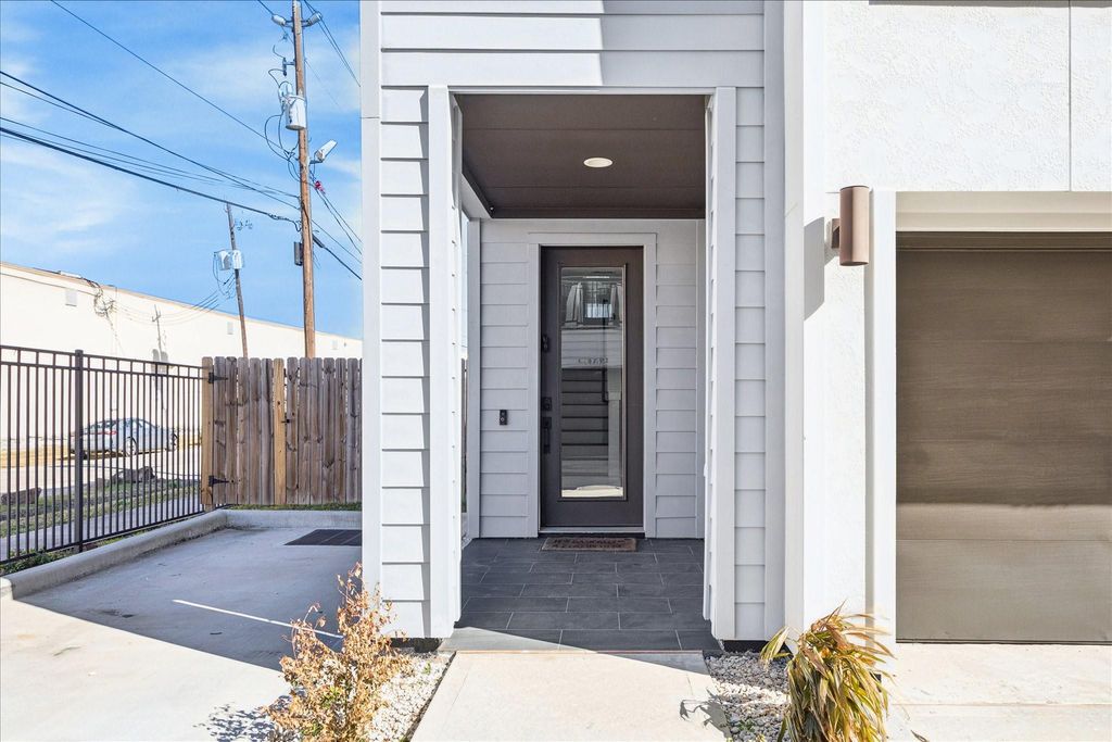 Modern city living at its best in this contemporary three-story home, just minutes from the University of Houston and downtown and within 15 mins from River Oaks, Heights and More! This low-maintenance home offers peace of mind along with rare in-city perks including NO HOA and a fully fenced backyard in gated community. The first floor features an attached garage and a private bedroom suite, ideal for guests, roommates, or a home office. The light-filled second floor offers an open layout with wide-plank wood floors and a stylish kitchen with stainless steel appliances, soft-close cabinetry, and a large island perfect for everyday living or entertaining. Step onto the balcony for a relaxing city retreat with automatic blinds. The top floor showcases a spacious primary suite with double sinks, a soaking tub, separate shower, and downtown views. Third bedroom with its own bath and walk-in closet adds flexibility. Comfort, style, and convenience come together in this exceptional home.