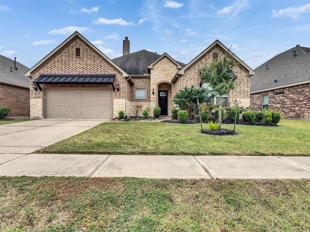 Motivated Seller! Welcome to this stunning single-story home in Katy Trails! Designed with an open-concept layout, this residence includes a 3 bedrooms, 2.5 baths, a media/flex room and a lovely covered terrace. High ceilings create an upscale feel, while tile flooring flows throughout the main living areas. The kitchen is bright and modern with a generous island, modern countertops, stainless appliances and inviting dining space; open to the family room, where you also find a stone corner fireplace and beautiful wood ceiling beams. The primary suite features dual vanities, an oversized shower and dual shower head, a soaking tub, and an expansive walk-in closet. Step outside to a covered patio with a ceiling fan. Yard with complete sprinkler system. Walk-in closets in every bedroom and a large laundry room. Zoned to highly rated Katy ISD. Short walk to parks and shopping. Welcome to see it!