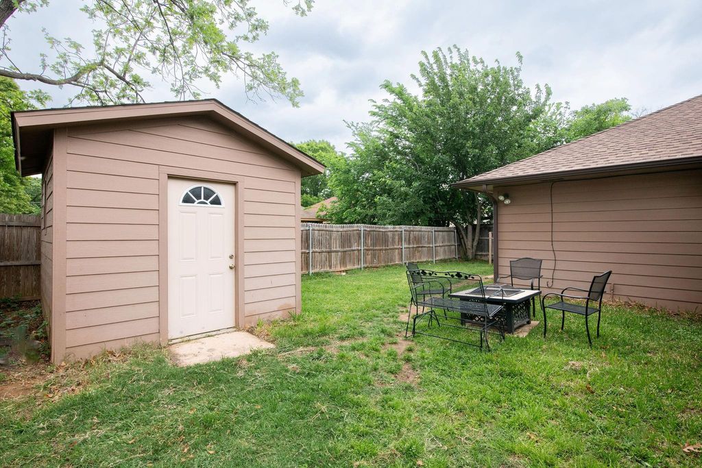 Tucked beneath a canopy of magnificent mature trees on a quiet Denton street, this charming brick home offers incredible curb appeal, warmth and character at every turn. Five bedrooms offering space and flexibility that is hard to come by make this a truly special find. A thoughtful layout flows naturally from room to room, perfect for everyday living and entertaining. Inside, a vaulted living room with a striking wood beam and brick fireplace creates an instant sense of home. The kitchen features granite countertops and generous cabinet space, opening to a sunny dining area. The generously sized primary suite boasts a walk-in closet and updated bath with double granite vanities. The private backyard with storage shed and wood privacy fence is perfect for entertaining. A rare combination of space, charm, and character. No HOA and a two car garage round out this wonderful home. This one is a must see!