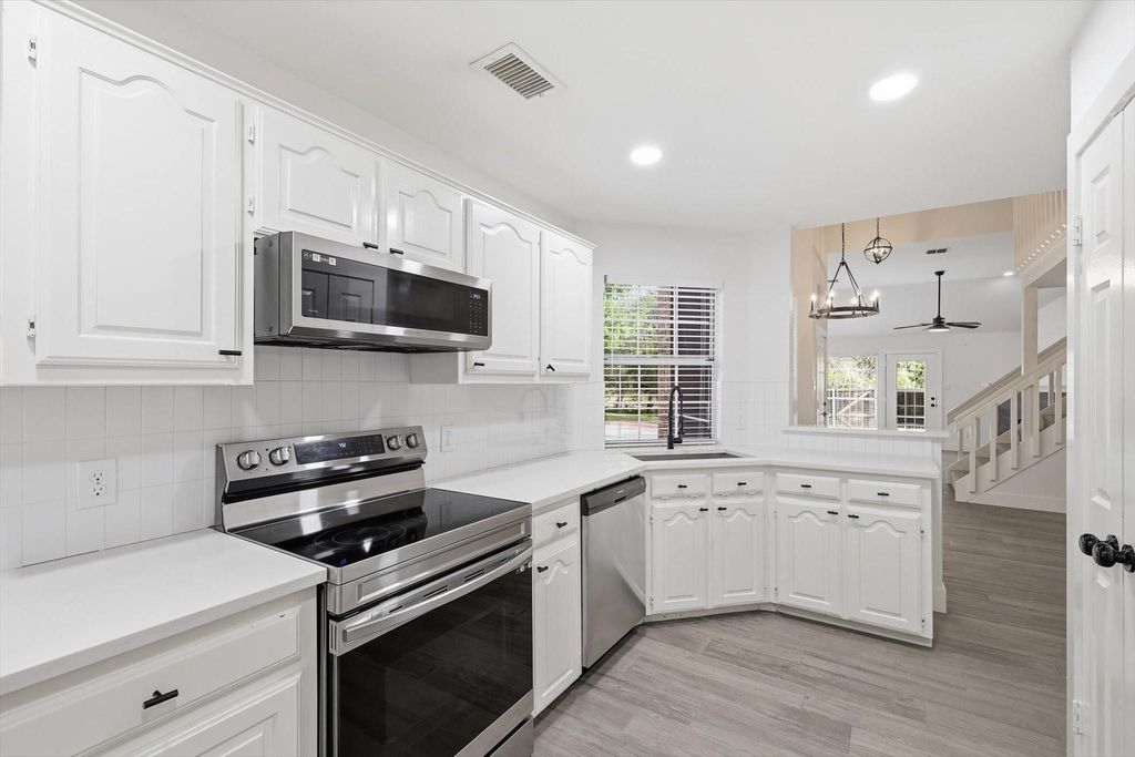Step inside to an inviting, light-filled interior featuring soaring ceilings and an abundance of windows that create a bright and airy atmosphere throughout. The spacious living area is anchored by a sleek, modern fireplace and flows seamlessly into the dining space—perfect for everyday living or entertaining. The updated kitchen shines with crisp white cabinetry, stainless steel appliances, ample counter space, and a functional layout that opens to the main living areas. Each bedroom offers generous space and flexibility, while three full bathrooms provide added convenience for residents and guests alike. Enjoy a private outdoor patio area—ideal for relaxing or hosting—without the upkeep of a large yard.