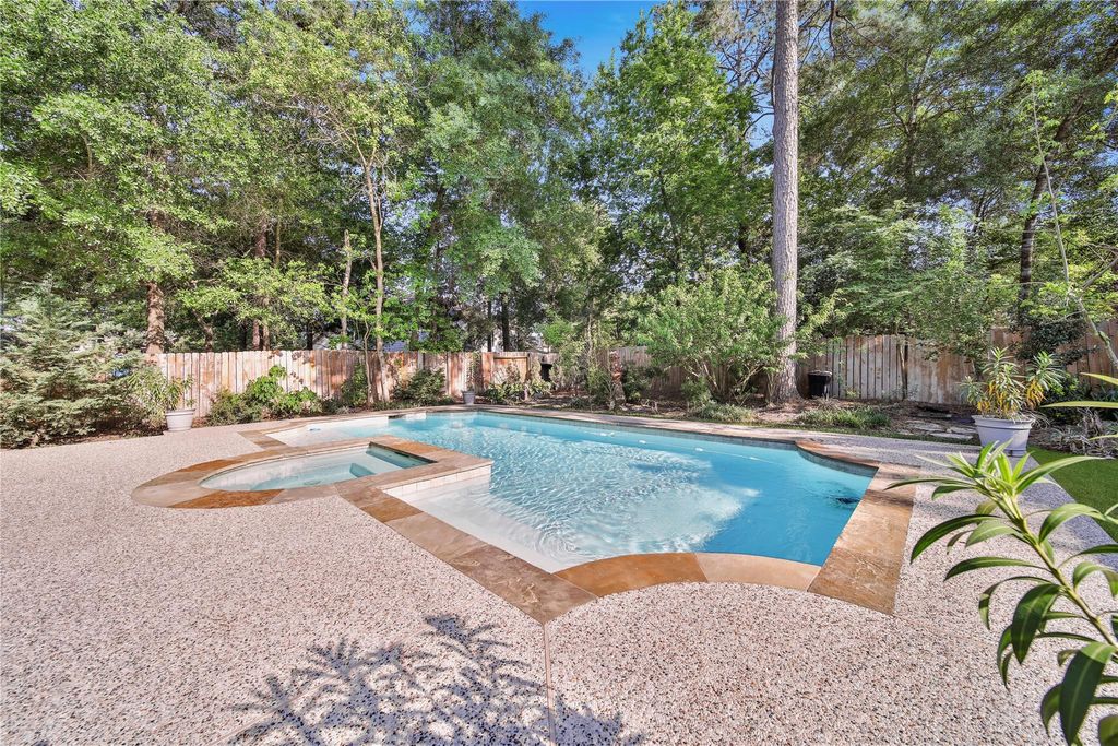 Come see this gorgeous single story home on a quiet cul-de-sac street in the fantastic Village of Sterling Ridge in The Woodlands with its own private backyard pool and spa!!! Super versatile floor plan offers 3 bedrooms plus an office. Island kitchen is open to the living room-perfect for entertaining or keeping an eye on the little ones. Spacious Primary suite has his and hers closets, tub, plus separate walk-in shower. Beautiful wood floors flow through the living, dining, master bedroom, office, and one of the secondary bedrooms; the only carpet in the home is in one secondary bedroom. The backyard is truly an oasis and is complete with gorgeous pool, spa, covered patio, and plenty of room for outdoor furniture and chaise lounges. Easy access to shopping, restaurants, and all of The Woodlands' fabulous amenities. Fresh, clean, and ready for a quick move in! Refrigerator included!! Zoned to highly rated CISD schools. Call for your private tour today!!