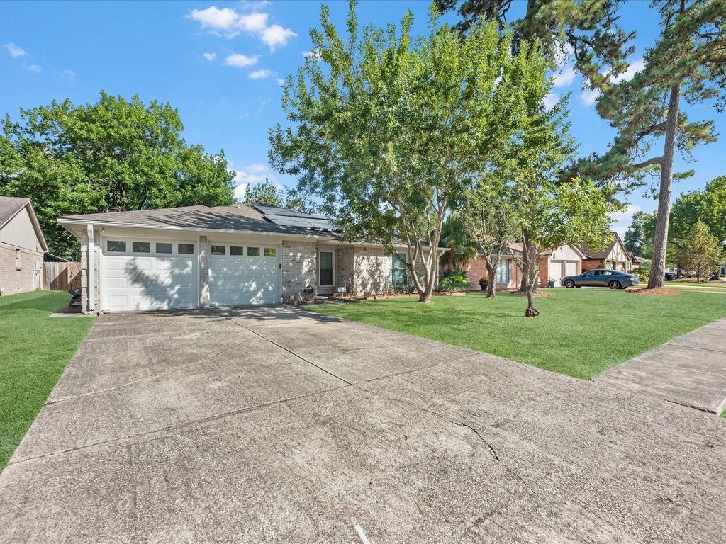 Charming & well-maintained 1-story home in Atascocita South! A rare find offers 4 bedrooms, 2 bathrooms, & 2-car garage—all at an exceptional value. While the home has a slightly dated aesthetic, it's been meticulously cared for & is move-in ready. Tile flooring extends throughout the main living & high-traffic areas. Spacious family room features vaulted ceilings & an open-concept to the kitchen; granite countertops, 6-burner gas range, microwave, & refrigerator. French doors lead to a covered back patio. A convenient pass-through window connects the kitchen to the outdoor bar area, making hosting gatherings a breeze. Huge primary suite includes a sitting area, raised ceiling & recently installed carpet that has never been lived on. Secondary bedrooms feature laminate flooring. Recent windows and solar panels deliver energy efficiency and reduce utility costs. Conveniently located near shopping, dining & major roadways, this home offers both comfort & practicality. Great opportunity!