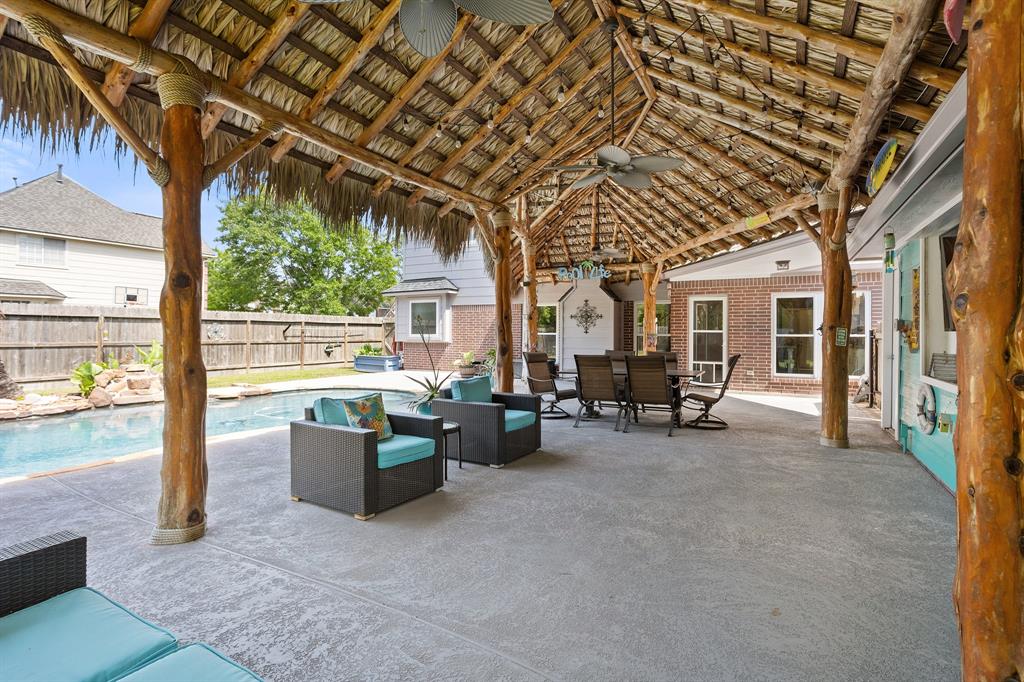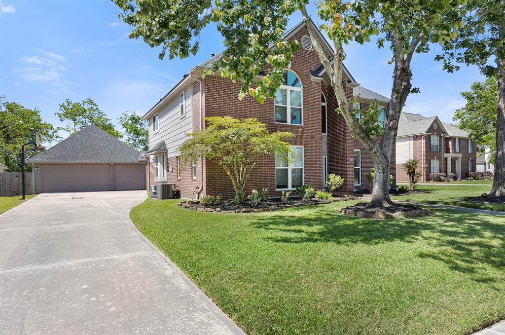NEVER FLOODED! This exquisite property features a very private backyard with a sparkling pool and waterfall. The extended 870 square foot 3-car garage is a standout feature, perfect for storing cars, boats, and a workshop. Recent upgrades include a new roof in 2022, downstairs AC in 2022, upstairs AC in 2023, and new water heater in 2023. Double pane windows! The fully remodeled gourmet kitchen has a fantastic and spacious island and boasts quartz counters, double stainless ovens, a built-in gas cooktop, and built-in microwave. The bathrooms have also been completely renovated. Enjoy the 700 square foot huge covered back patio wired for TV and speakers, along with a gas connection for grilling. The upstairs game room is a great place to watch a movie or just hang out! Award winning Friendswood ISD. Less than a mile to Stevenson Park on Bike/jogging trail. 5 Minute Walk to HEB Grocery.