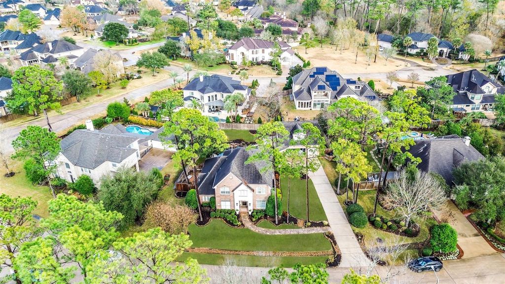 Gorgeous 4-bedroom, 3.5 bath estate home in highly sought-after Forest of Friendswood boasts beautiful finishes, a 1/1 garage apartment over the 3-car garage, & a pool surrounded by rock waterfalls & an oversized lot with a park-like feel & nice shed! Step inside to find a grand foyer with handsome wood floors & sunlit windows dressed with plantation shutters, flanked by an elegant dining room & a secluded study. At the heart of the home, a cozy den boasts a stacked stone electric fireplace & a seamless transition to the fabulous island kitchen with quartz counters, a subway tile backsplash, white cabinetry, & stainless appliances. The spa-worthy owners retreat showcases dual vanities, a custom closet organization system, a frameless glass shower & a freestanding tub set against a stone wall with another electric fireplace. Upstairs, find a game room with wet bar, 3 bedrooms, & 2 baths. The garage apartment with full bath & kitchette is perfect for guests or multi-generational living.