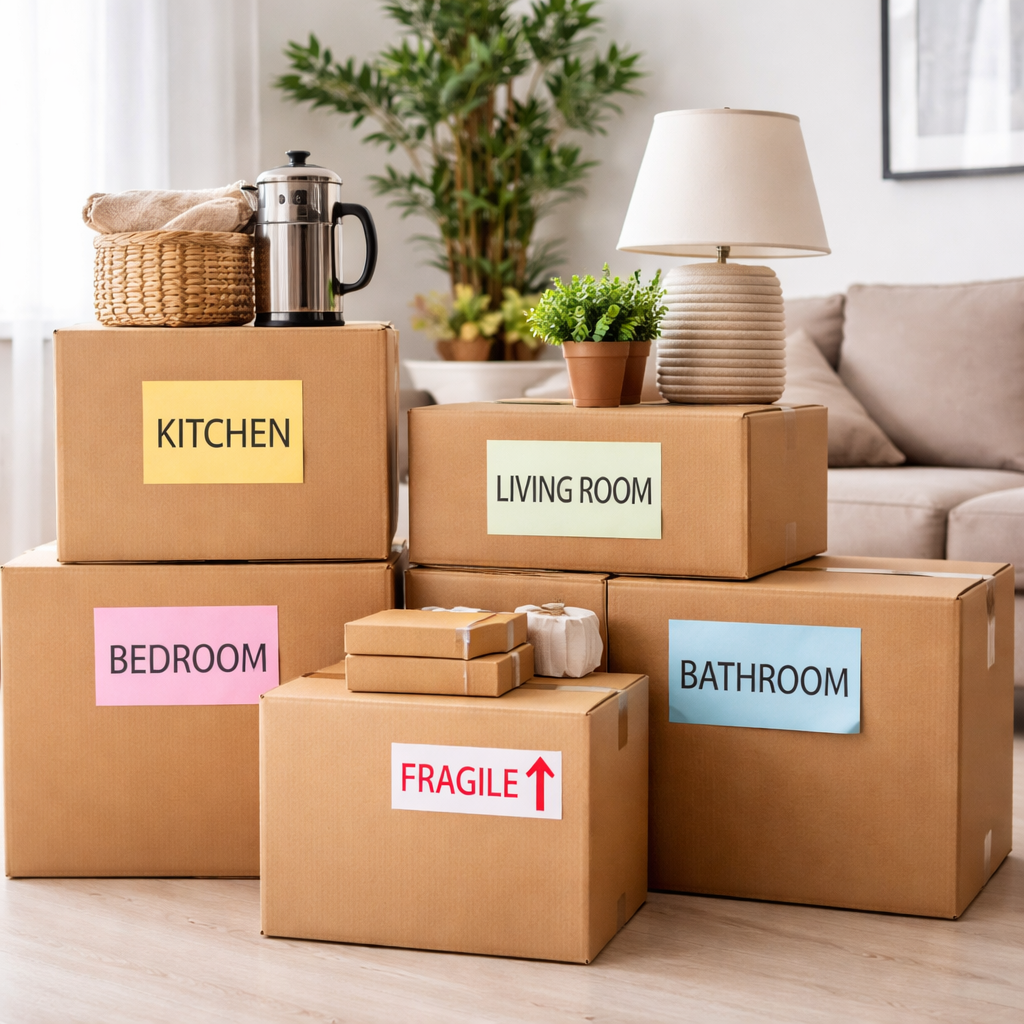 Bonus tip: Use color-coded labels for each room to make unloading faster.