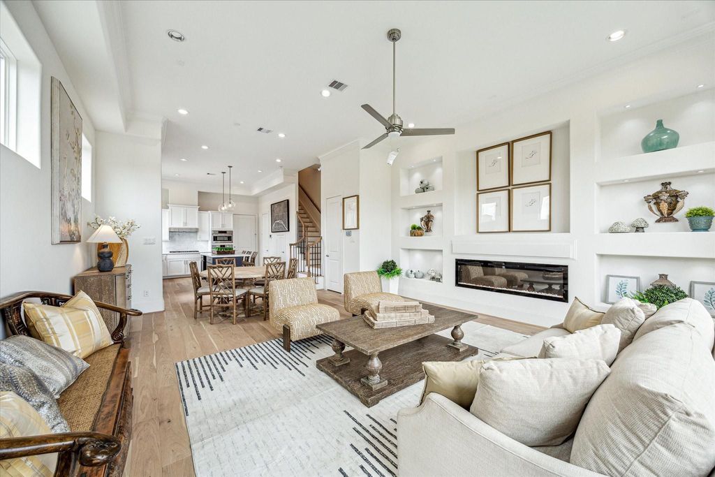 Stunning & unique must-see FIVE BEDROOM home with game room/rooftop terrace with wide unobstructed DOWNTOWN views and very spacious private fenced BACKYARD! First floor living home in the beautiful gated community of Timbergrove Green. Enjoy soaring 12ft ceilings in your living area with epic 10ft glass sliding doors leading from your spacious living room to backyard. Chef's kitchen features SS Bosch appliances, furniture grade high quality cabinets, carrera white marble backsplash, and quartz countertops. Living room boasts custom shelving and built-ins with luxe electric fireplace & accent lighting for a WOW factor. Primary 5 star spalike bath is adorned with real imperial white marble slabs and elegant freestanding tub. One of the secondary bedrooms have a beautiful juliet balcony. Must see in person! Elevator capable.