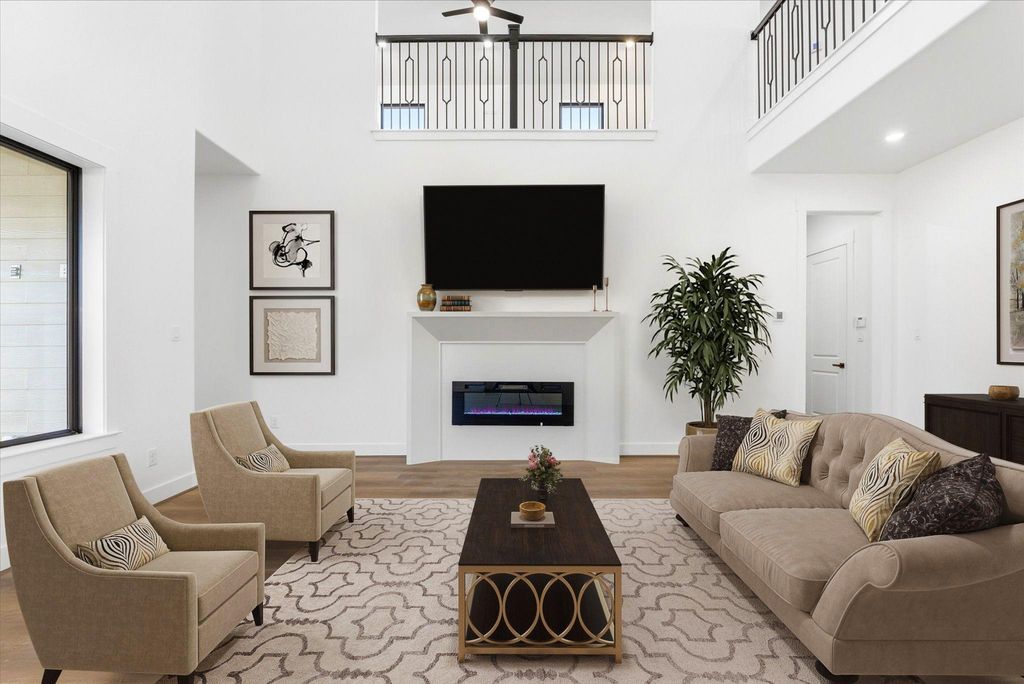Welcome to 741 S Carroll! A striking stone & brick exterior, extra-wide driveway, soffit lighting, and exterior outlets add curb appeal and functionality. Inside, enjoy 21-foot ceilings, luxury vinyl flooring throughout, and a dedicated office. The open-concept living area features a fireplace and flows seamlessly into the dining area and covered back patio.The kitchen showcases an oversized island, beveled quartz counters, gold hardware, custom solid-wood cabinetry, and stainless steel appliances. The first-floor primary suite offers 11ft ceilings, a spa-like en suite with glass-enclosed walk-in shower, dual sinks, and a spacious walk-in closet. A powder bath & laundry room complete the main level. Upstairs includes a versatile family room, secondary bedrooms with walk-in closets, and two full baths. The backyard features fresh grass, new fencing, a covered patio with ceiling fan and a mature tree. Insulated garage with automatic opener and storage!