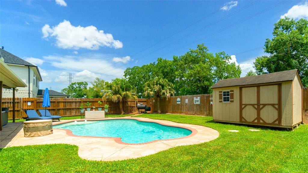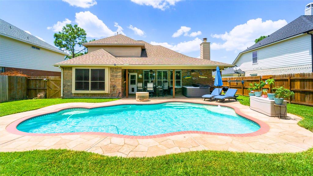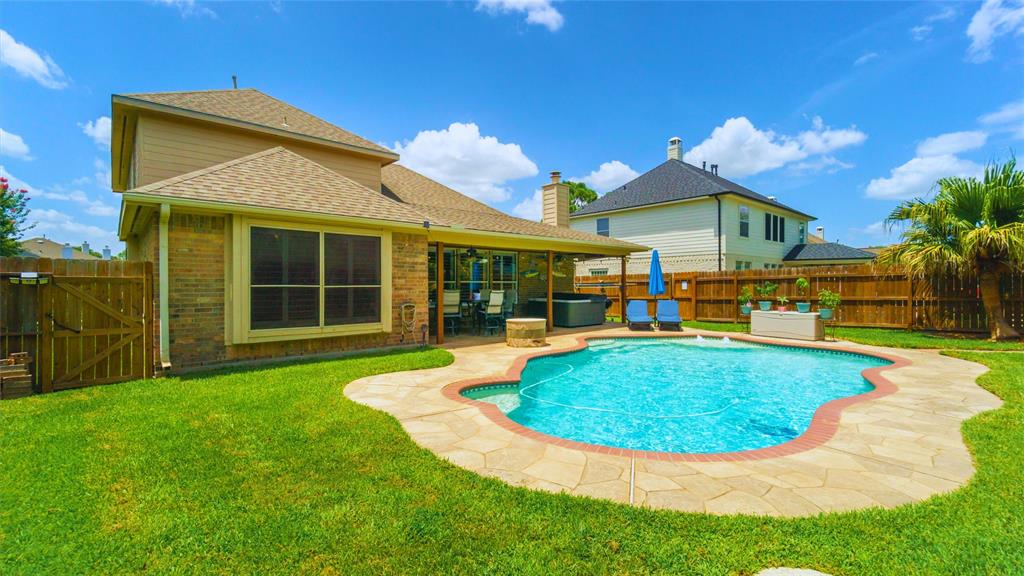 Step right into this delightful gem nestled in the Claremont subdivision, where your backyard dreams come true! Picture this: a spacious covered patio, a sparkling pool, and—wait for it—no nosey rear neighbors! Located in prestigious CCISD, Claremont is in the heart of west League City w/perks galore: a community walking trail right at your back door, community pool, parks, and-hello.....Neighborhood Walmart, shops along 518, + easy breezy access to I-45! This home has been pampered with love & boasts shiny upgrades like a newer roof, an updated HVAC system, porcelain tile flooring, fresh paint (even upstairs got a glow-up!) The spacious kitchen and outdoor area are just begging to host your next bash, making it a fabulous spot for family fun in a friendly neighborhood filled with awesome neighbors. And guess what? This beauty has never seen a flood (X flood zone), though the owners have a current flood policy that can be transferred. What are you waiting for? Your dream home await