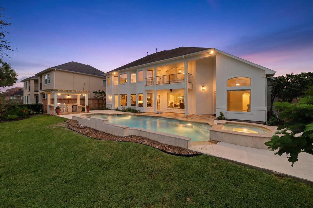 Super rare opportunity in one of Shadow Creek Ranch’s most sought-after enclaves, The Island - featuring beautiful semi-custom homes on large lakefront estate lots. Homes don't come on the market in here very often. This elegant stucco residence offers soaring ceilings, abundant natural light and an open-concept layout ideal for entertaining. The study showcases floor-to-ceiling built-ins, while the flexible plan includes a rare first-floor secondary bedroom with full en-suite bath. The primary suite features a sitting area, backyard access and serene views. Step outside to your private oasis and relax in the pool or hottub while enjoying the breathtaking TX sunset over the lake. Upstairs, you will find a game room, two bedrooms connected by a jack-n-jill bathroom and aother flex-room that can be used as a bedroom or a number of other uses. The upstairs balcony also offers yet another tranquil space. Move-in ready with easy access to highways, shopping, dining, and top-rated schools.