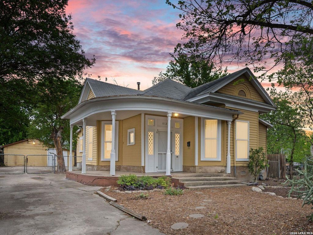 612 N Pine Street is listed for sale at $ 288,000. The Single-Family - Historic property has 2 bedrooms, 2 Full Bathrooms, 1404 square feet and was built in 1912. The lot size is 0 Square feet. ##BR##Classic Historic Dignowity home with old world charm and modern touches. A fantastic wrap-around front porch greets you as you enter this 2/2 PLUS home with high ceilings, original molding, doors, and built-ins, wood floors, lots of windows, and light-filled rooms. An optional spacious flex room could be a study, a third bedroom, a formal living room, a den, etc. The open kitchen with eat-in area opens to a large fenced back yard, allowing for fun entertaining possibilities. A bonus area off the primary bathroom allows for a walk-in closet or small office. Great locale around the corner from Pancho and Gringo’s and a hip retail center, and 1 block from Dignowity Park and garden! A short distance to the Hayes Street bridge, Downtown, Fairchild Park pickleball and tennis courts, and east side eateries. If you appreciate historic details, you will love this home!