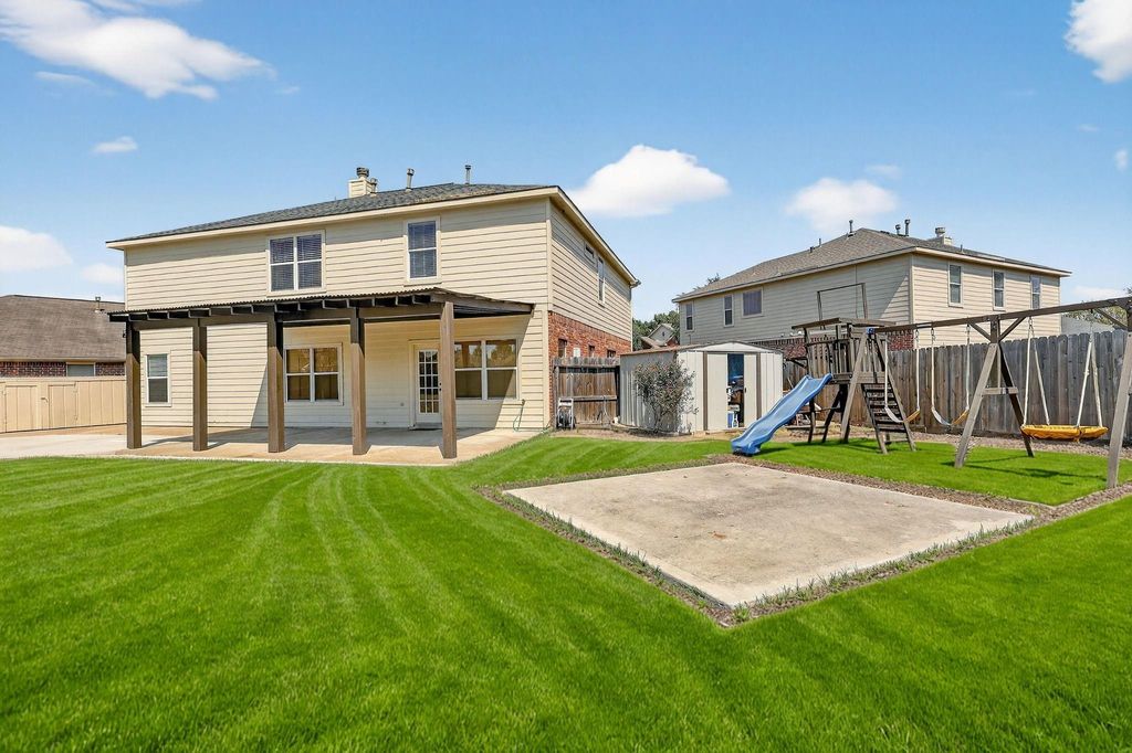 Located at the end of a quiet cul-de-sac, this beautiful home offers privacy, convenience, and style. Just minutes from major highways and the new Costco, the location is ideal for everyday living. The stunning kitchen features elegant white and gold finishes, cabinetry to the ceiling, abundant storage, and a large island perfect for entertaining. A spacious dining area provides plenty of room for gatherings. The oversized primary suite includes a custom walk-in closet system for comfort and organization. With five bedrooms total, there is ample space for family, guests, hobbies, or a home office. The laundry area is enhanced with custom-built cabinetry for added functionality. The backyard offers endless potential—design a pool, outdoor kitchen, or garden oasis. Additional features include a large covered concrete area wrapping around the side of the home, two storage sheds, and a playground. This home has never flooded and is ready for its next owners.