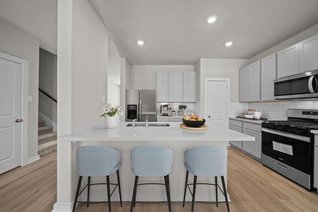 Welcome to this stunning 2,406 sq. ft. two-story home located in the highly desirable Laurel Landing community. From its eye-catching stone front exterior to the beautiful 8' contemporary front door, this 4-bedroom, 2.5-bath home combines curb appeal with thoughtful design. Inside, you’ll find an inviting home office with elegant double doors, perfect for remote work or quiet focus. The open-concept kitchen is ideal for entertaining and everyday living, featuring Omegastone countertops, custom cabinetry, and premium finishes throughout. Upstairs, unwind in the luxurious master suite with a relaxing soaking tub, surrounded by serene design and high-end touches. Enjoy peaceful mornings and tranquil evenings in the backyard overlooking the community’s water feature, offering views that soothe and inspire. With a 2-car garage and every detail carefully curated for comfort and style, this home offers the best of modern living in a naturally beautiful setting.