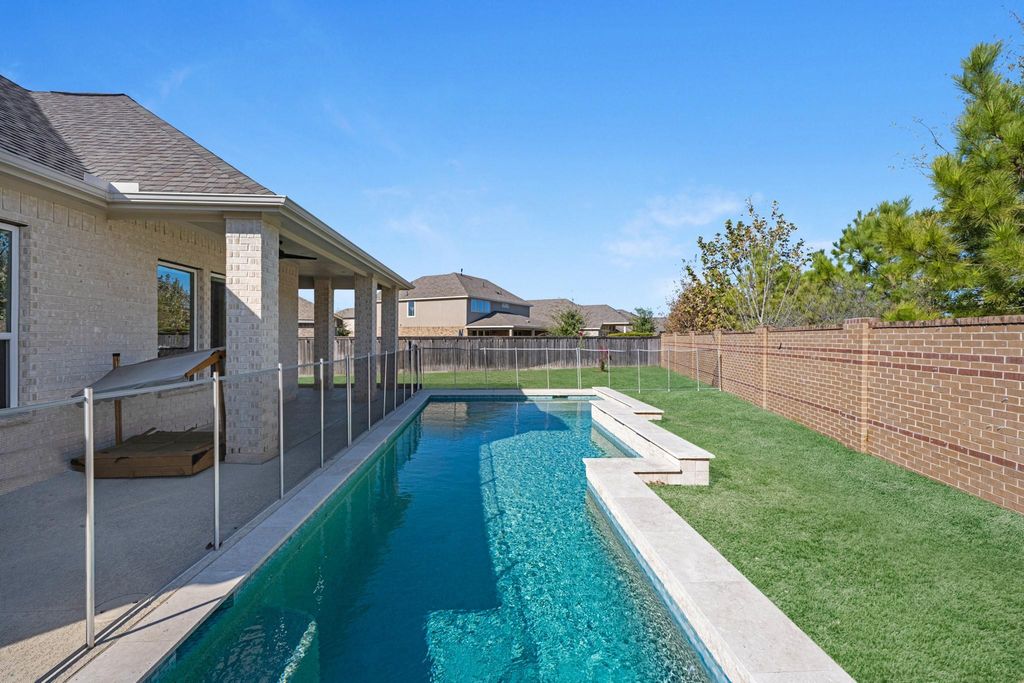 Nestled in a quiet cul-de-sac, this home offers privacy with no rear neighbors and a brick wall. The single-story layout features 4 bedrooms, 3 full baths, and a flex room/study office. Outside, a saltwater pool and wrap around covered patio are perfect for entertaining. Inside, enjoy high ceilings, Shaw wood look luxury vinyl flooring, and tile. The kitchen boasts quartz counter tops, white cabinets, Coffee Bar and a large island. The primary bedroom overlooks the pool and includes a soaker tub, separate large walk in shower and double vanity sinks. Additional features include a child protective fence around the pool, gas line stub out(for your outdoor grill), included appliances(Refrigerator,Washer, Dryer) Full House Gutters and Full Yard Sprinkler System.Zoned to CFISD
