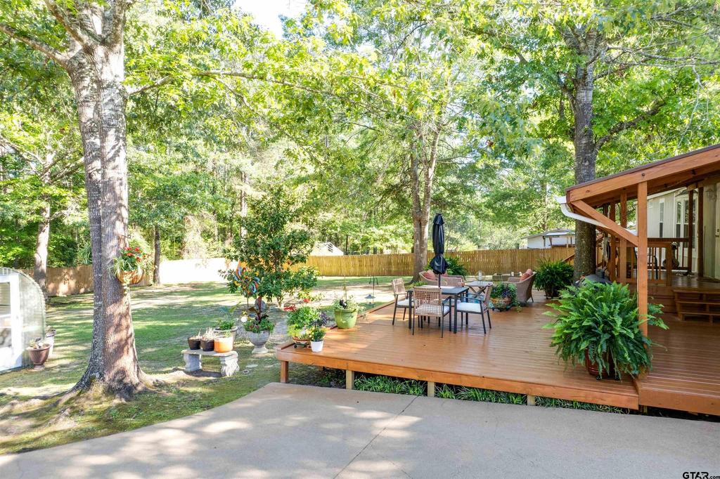 Outdoor oasis in award-winning Hallsville ISD! Tucked beneath mature shade trees, this meticulously maintained home offers the perfect blend of comfort, charm, and space. Feels like new with an inviting open-concept layout, spacious living areas, abundant natural light, and a warm, cozy feel throughout. Large bedrooms provide comfort for everyone, while the spacious primary suite features a relaxing garden tub in the ensuite bath. Step outside to your own private retreat with a huge custom deck perfect for entertaining, grilling, or morning coffee, plus a fully fenced backyard with plenty of room to roam. Mature trees provide shade and privacy, while the workshop/storage buildings, greenhouse, RV hookups, and included golf cart add incredible versatility. Move-in ready and will qualify for FHA financing!