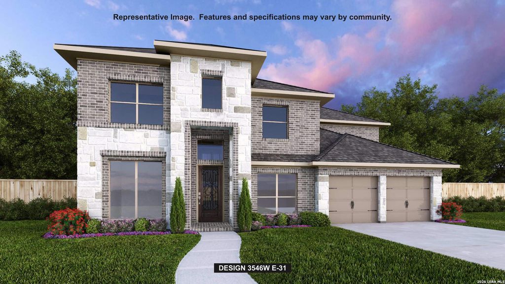 Home office with French doors and formal dining room along one side of two-story entry. Two-story family room with wall of windows and a fireplace opens to kitchen and morning area. Kitchen features walk-in pantry, a butler's pantry and generous island with built-in seating space. First-floor primary suite. Dual vanities, a freestanding tub, separate glass-enclosed shower and two walk-in closets in primary bath. A second bedroom is downstairs. Media room, game room and three secondary bedrooms are upstairs. Extended covered backyard patio. Mud room off three-car garage.