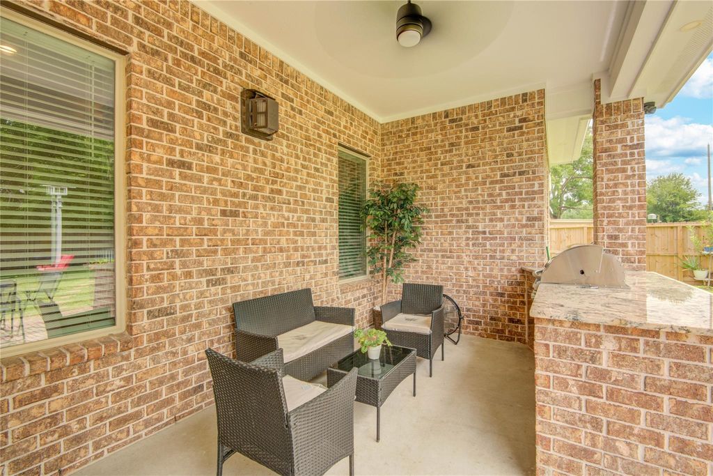 Introducing stunning, 2023 custom-built home, thoughtfully designed with luxurious features. This spacious one-story property boasts 3 bedrooms 2 bathrooms, an office, with wood look tile flooring throughout (no carpet). Inside, you'll find a cozy fireplace, neutral paint tones, and custom cabinetry paired with luxurious light fixtures and premium kitchen appliances. Every detail is upgraded, from LED ceiling lighting to high-end hardware, with quartz countertops featured throughout. The primary suite is a true retreat, offering a large walk-in shower, a separate freestanding tub, dual sinks, quartz countertops, and an expansive walk-in closet. Energy-efficient windows enhance both comfort and style. Outside, the home is equally impressive, featuring a covered patio, a spacious fully-fenced backyard, all-brick, outdoor kitchen, and professional landscaping. Situated in a quiet desirable neighborhood, this is a rare opportunity to own a beautifully crafted custom home.