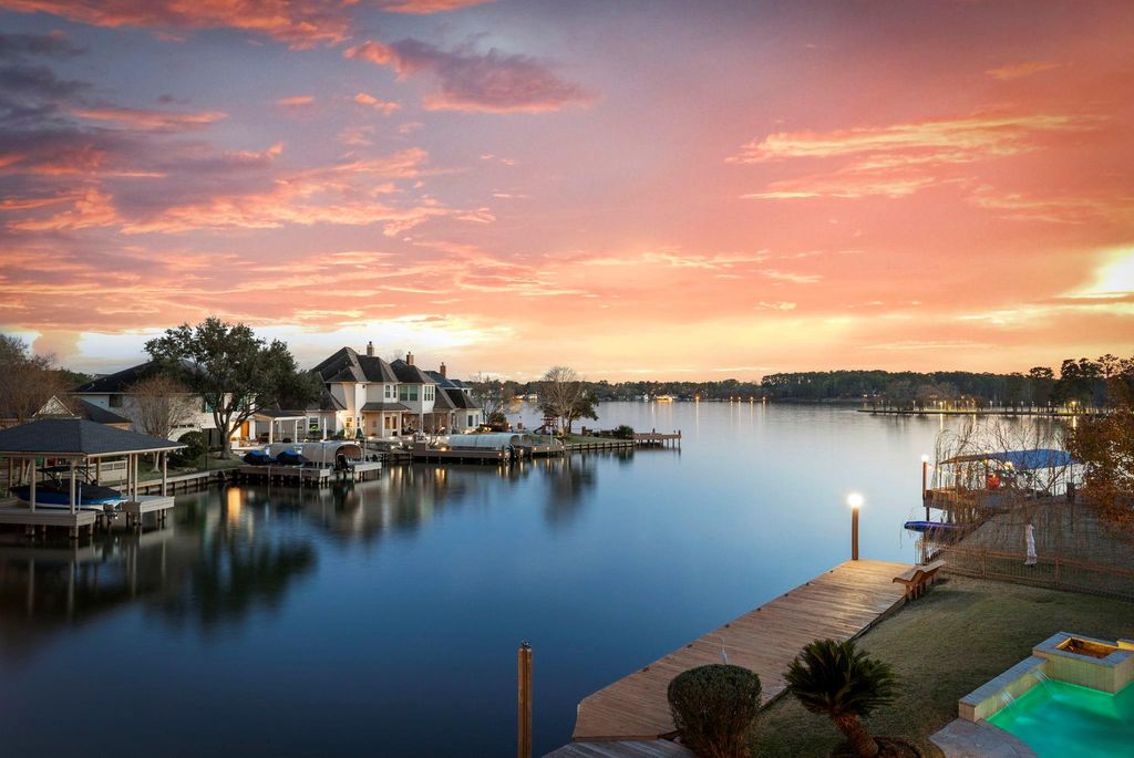 Set within the prestigious Bentwater Golf Community on Lake Conroe, this exceptional waterfront estate offers an unparalleled lifestyle of luxury and serenity. Spanning 1.5 waterfront lots, the property showcases breathtaking panoramic lake views from nearly every room and living space. Designed for both relaxation and entertaining, the home features a stunning pool overlooking the water, a fully equipped outdoor kitchen, and a spacious patio and second-floor balcony with captivating sunset views. The private dock includes lifts for both boat and jet ski, making lake living effortless. With a beautiful layout, expansive rooms, and impeccable condition throughout, this residence is a rare opportunity to own one of the most remarkable lakefront homes in Bentwater. Filled with unique artistic sculptures throughout, this home is truly such a gem!