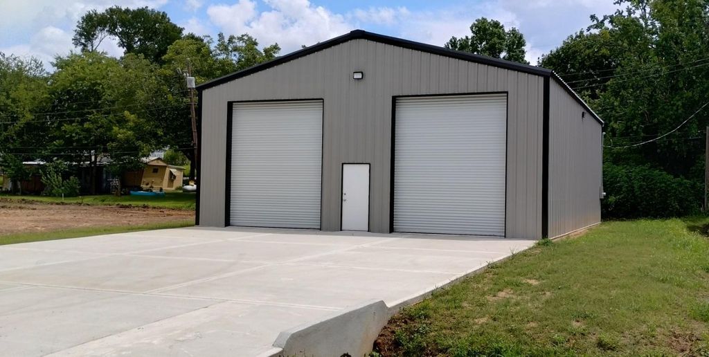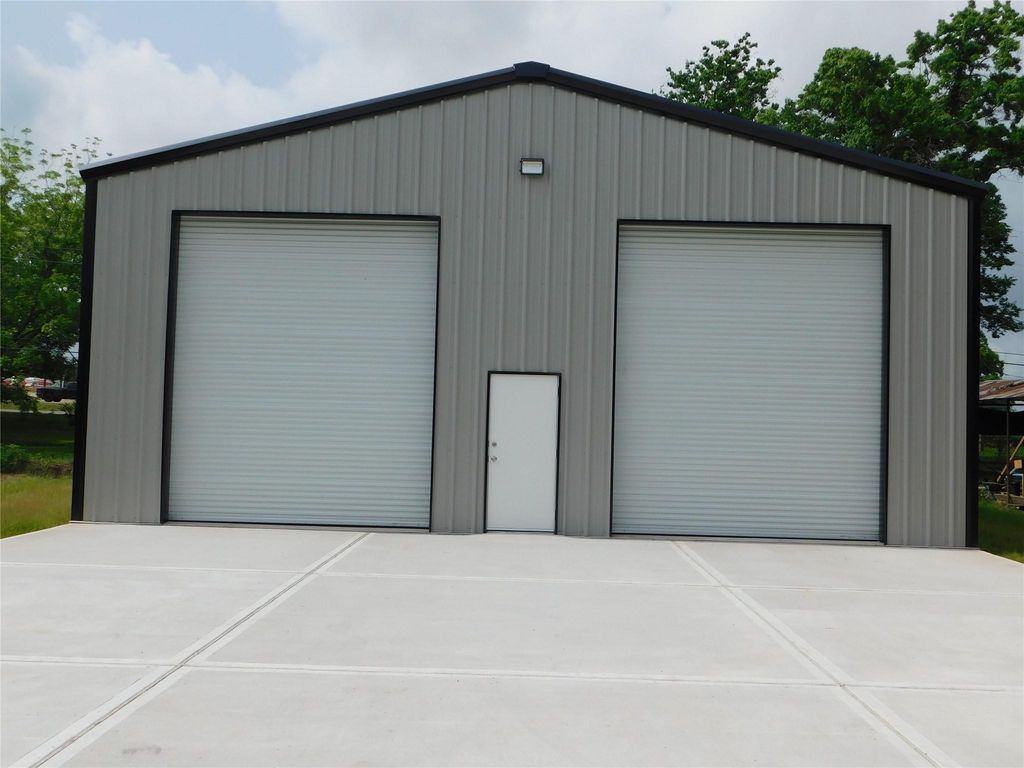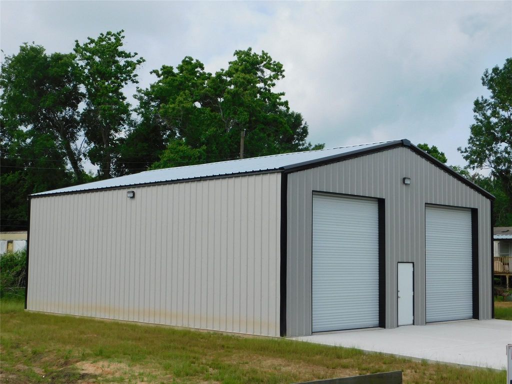 New 2000 sq ft metal building with two roll-up overhead doors plus center pedestrian door. Makes a great warehouse, workshop, RV storage or storage space. 200-amp service installed with excellent LED lighting, with extra wide driveway. Building is insulated. Roll-up doors are 12w x 14h on a 16ft eave height. Lot is cleared and leveled located near FM1097 and I-45.