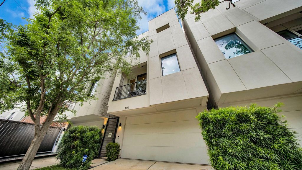 Welcome to 1717 Wentworth Street, located in the desirable Rice/Museum District. This modern home offers refined city living on a quiet, tree-lined street near top dining, museums, and galleries. The first floor features a spacious bedroom with a private bath and access to a low-maintenance backyard. The main level is bright and open, showcasing hardwood floors, large windows, and a seamless flow between the living, dining, and kitchen areas—complete with a wine bar, quartz countertops, stainless steel appliances, and a walk-in pantry. Upstairs, the primary suite offers a sitting area, dual closets, and a spa-like bath with a soaking tub and glass shower. An additional en-suite bedroom and a rooftop deck with stunning skyline views complete the home, along with a private driveway, balcony, and gated entry for added convenience.