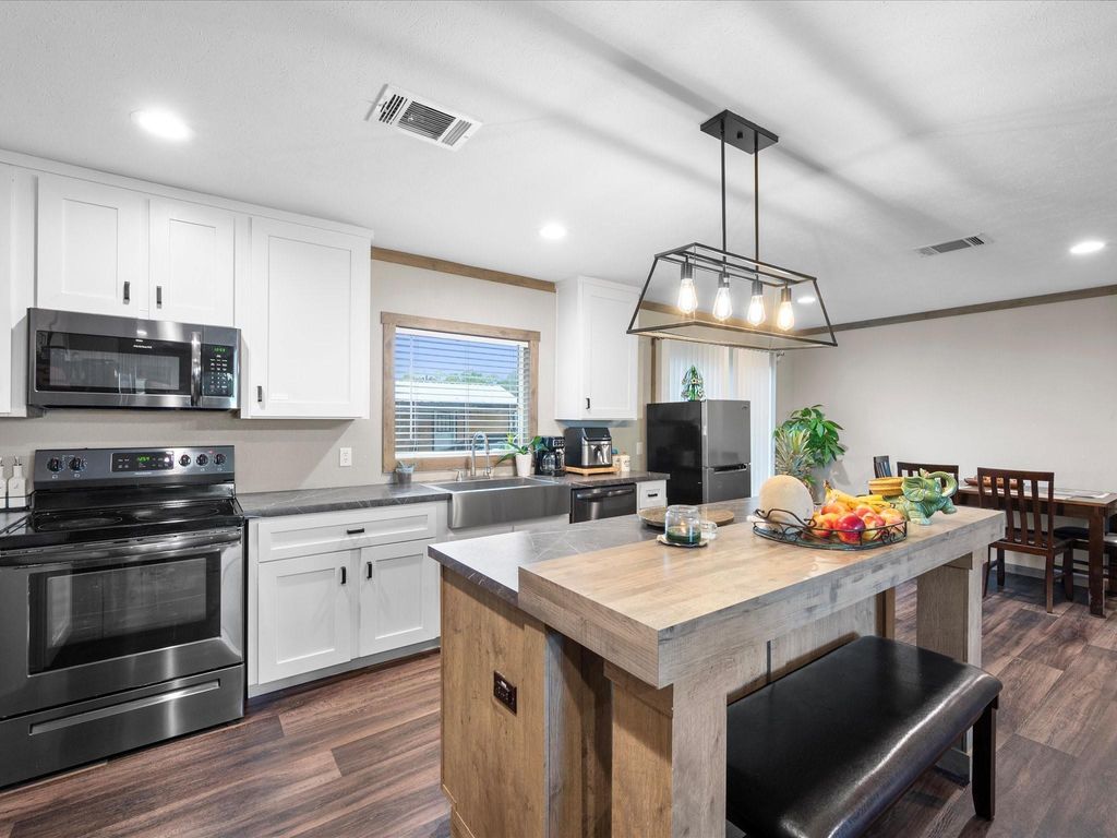 Charming and modern, this manufactured home sits on a level corner lot with a gated entry and gravel drive leading to a 2-car carport. Enjoy outdoor living on the covered front deck. Inside, you will find LVP flooring that runs throughout most of the home; the living room has a vaulted ceiling with wooden beams, recessed lighting, and a ceiling fan. The kitchen features a central island with an electrical outlet, a deep farm sink with backyard views, and modern lighting. The primary suite offers a ceiling fan and plenty of room for a king-sized bed; the primary bath has dual sinks, a soaking tub, a separate shower, and shelving. The secondary bedrooms are cozy with carpet, and the laundry room adds convenience. A stylish, affordable home with thoughtful details—don’t miss it!