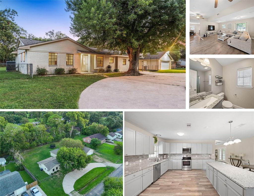 Nestled on over Half an Acre, this extensively updated property offers a separate Guest House, an oversized Garage/Workshop space and Updates throughout the Main Home including upgraded Vinyl Flooring, an expansive Kitchen with Huge Center Island, tons of Countertop space, SS appliances & Soft Closing Cabinetry. **2024 Updates** include Foundation Leveling with Transferrable Warranty and a New Breaker Box and Riser! Circular driveway greets guests; the front door opens to the large Living Room with vaulted ceiling and double doors that open to the HUGE fully fenced backyard! Primary Bedroom is 22’x15’ and offers plenty of room for a home office or gym. 3 Secondary Bedrooms including one with an en-suite bath all offer updated flooring, sizable storage closets and ceiling fans with lights. Guest House features two additional bedrooms, another updated full bath and a Large 23’x13’ Living Room! Never Flooded and *NOT* in the Flood Plain, Only ½ mile from HWY 6!